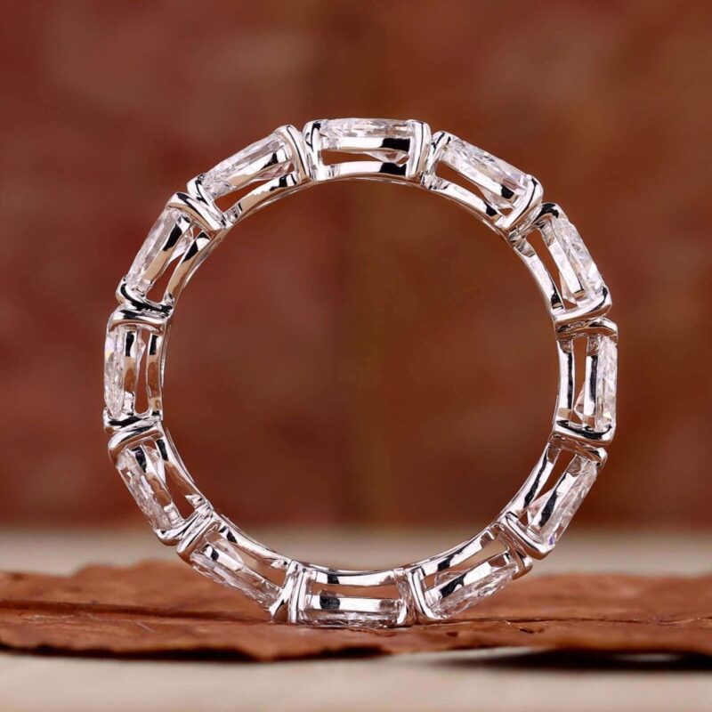 Eternity bands come in various metal options like platinum, 14k/18k/10k gold, and silver—each offering a different hue and price point.