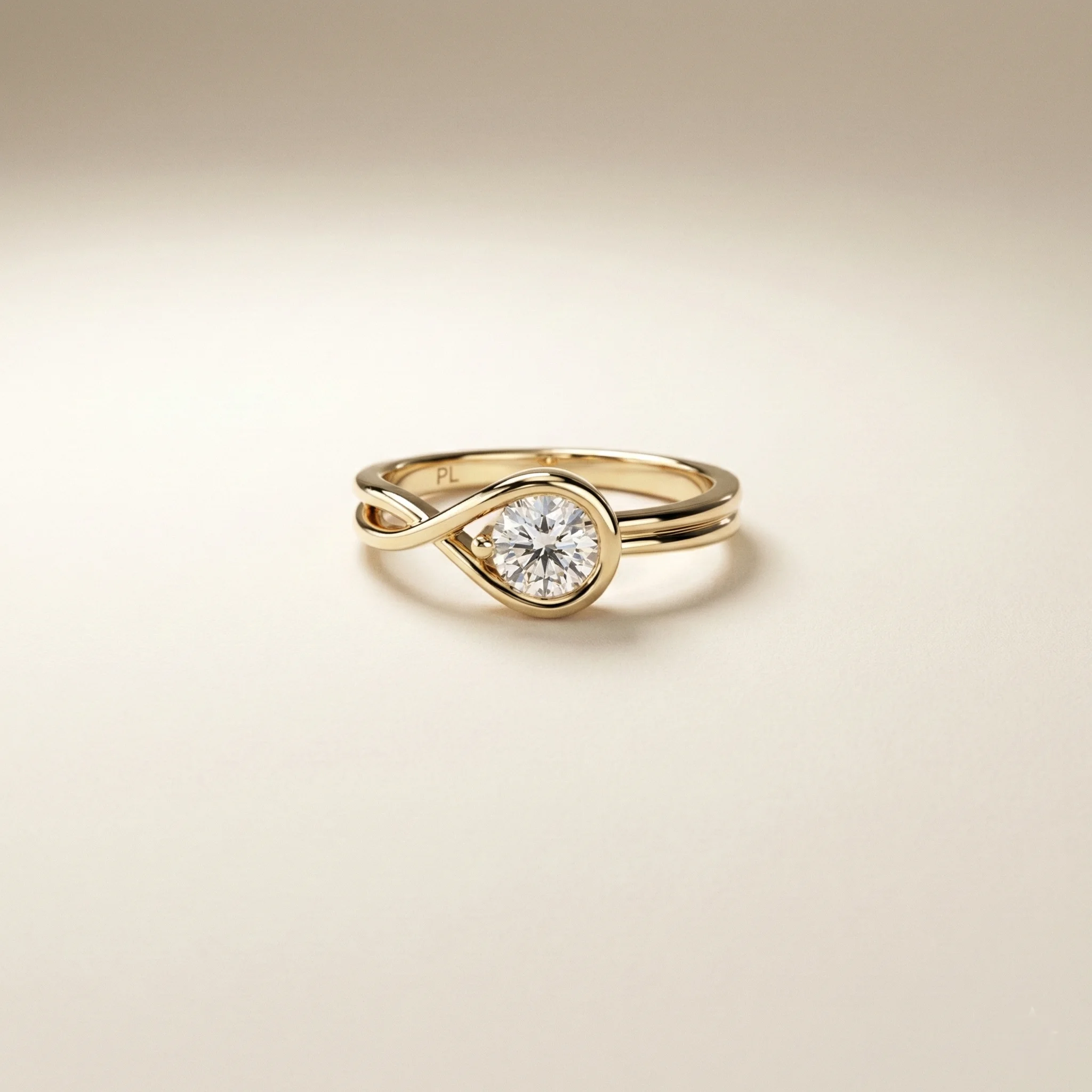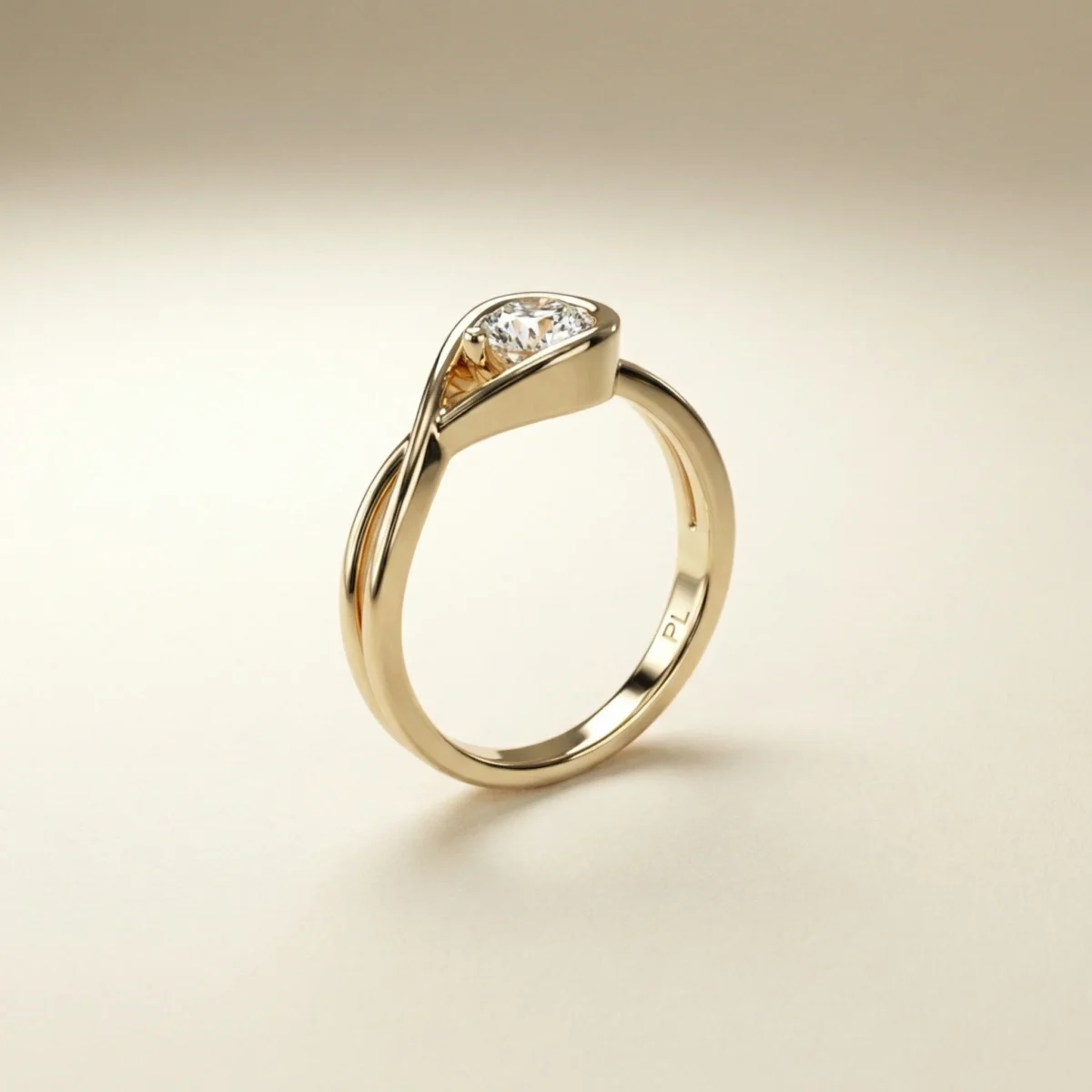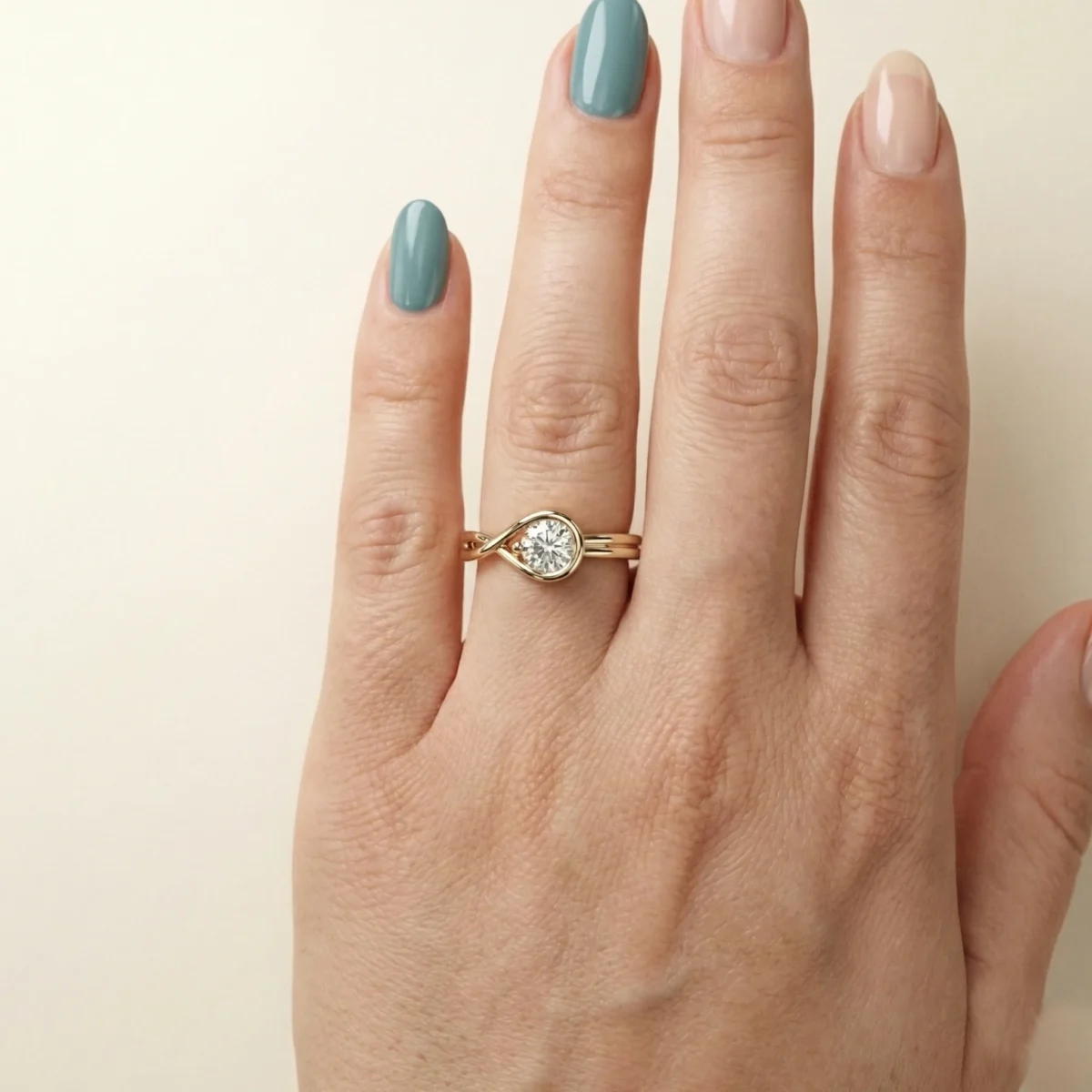Crafted around a 0.75 carat round brilliant lab grown diamond, the Aeris ring features a sculptural bypass bezel structure that frames the center stone with modern precision. The design balances clean metal flow with a protected stone setting, creating a refined engagement ring suited for daily wear. Proportional customization is supported across the recommended carat range, while maintaining the integrity of the original design architecture. Each ring includes professional certification and is produced within a 15–35 day timeline.