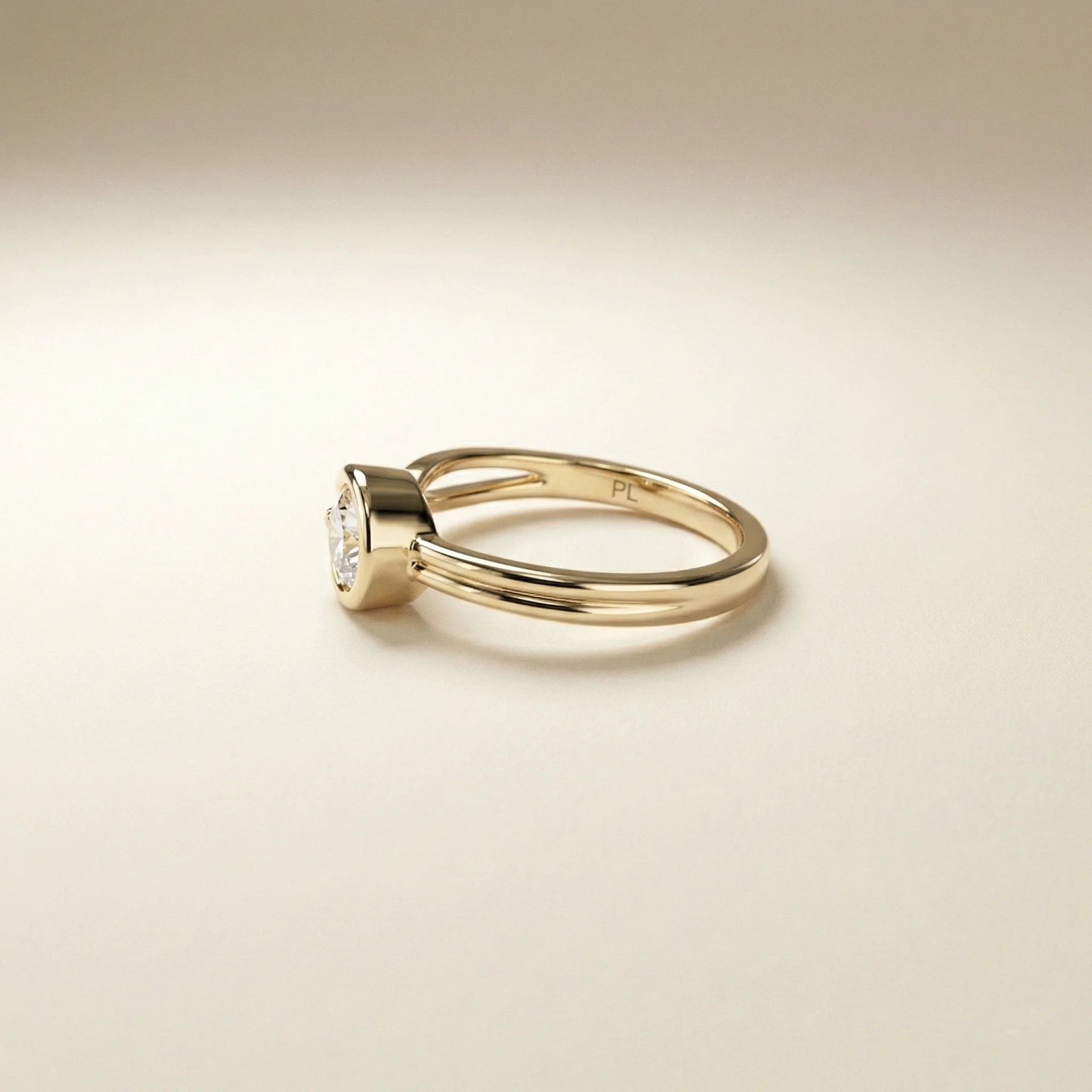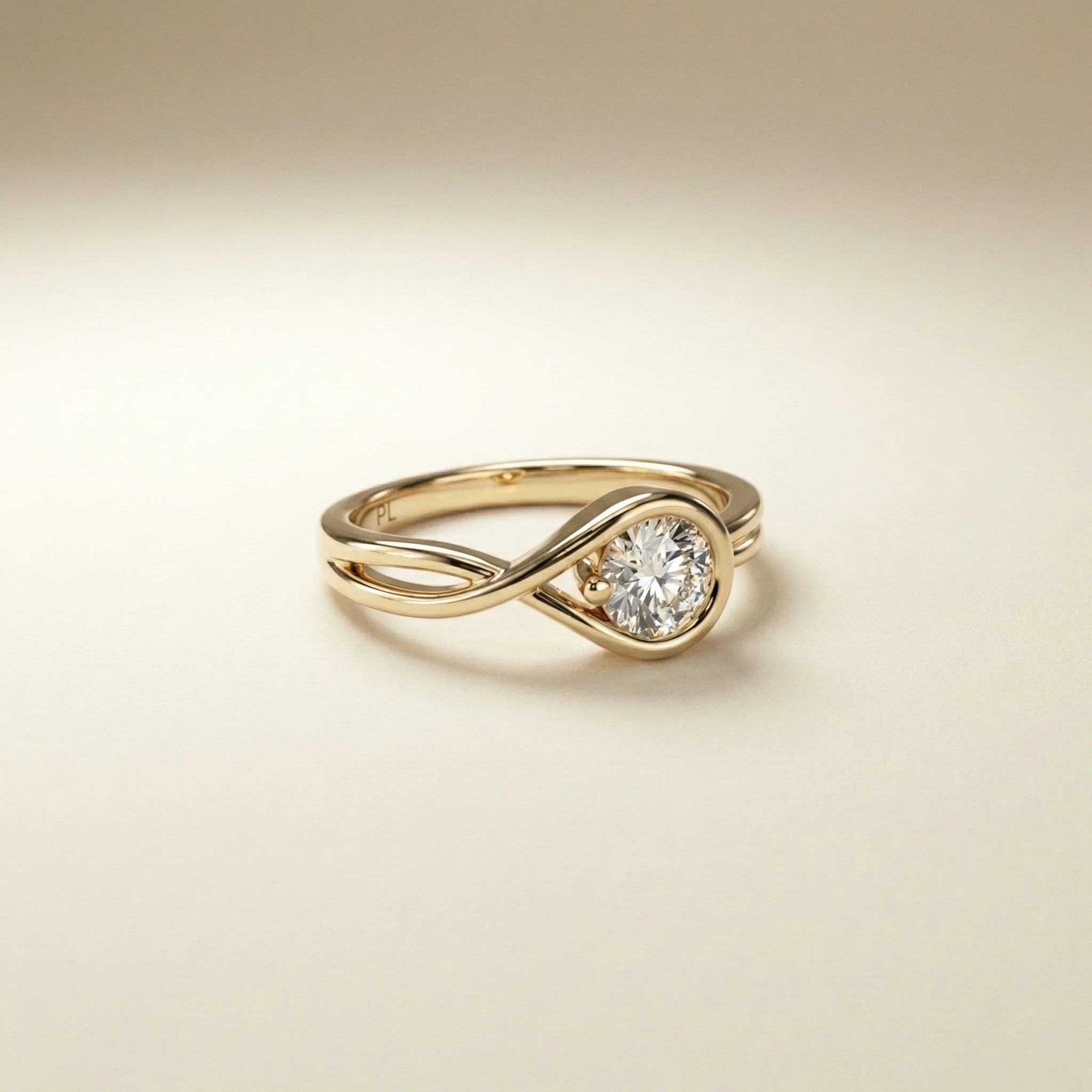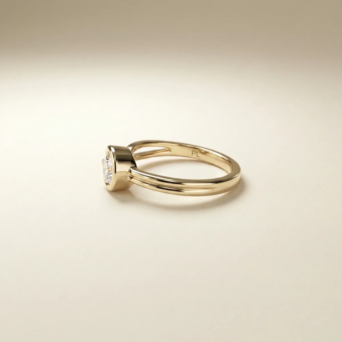 Crafted around a 0.75 carat round brilliant lab grown diamond, the Aeris ring features a sculptural bypass bezel structure that frames the center stone with modern precision. The design balances clean metal flow with a protected stone setting, creating a refined engagement ring suited for daily wear. Proportional customization is supported across the recommended carat range, while maintaining the integrity of the original design architecture. Each ring includes professional certification and is produced within a 15–35 day timeline.