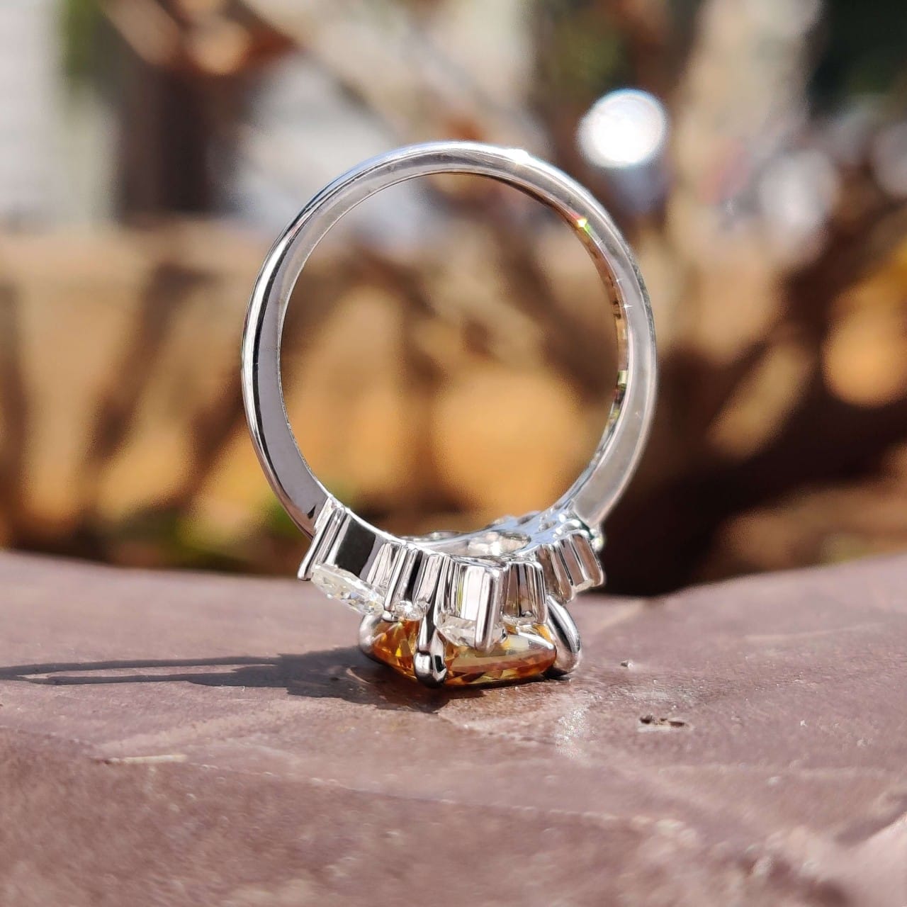 At its center rests a 2.5 carat cushion-cut champagne moissanite, radiating crystalline brilliance and warmth. Crafted in platinum with a classic white tone, this piece echoes the intimacy of a Parisian getaway, where it was once hidden inside a handwritten letter—a secret waiting to be revealed.
