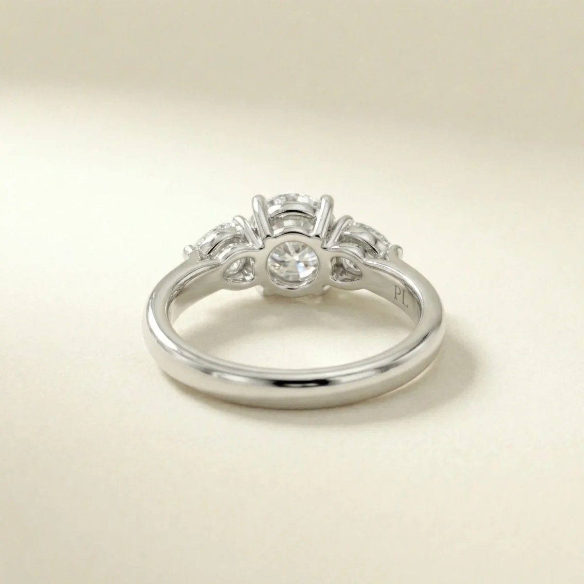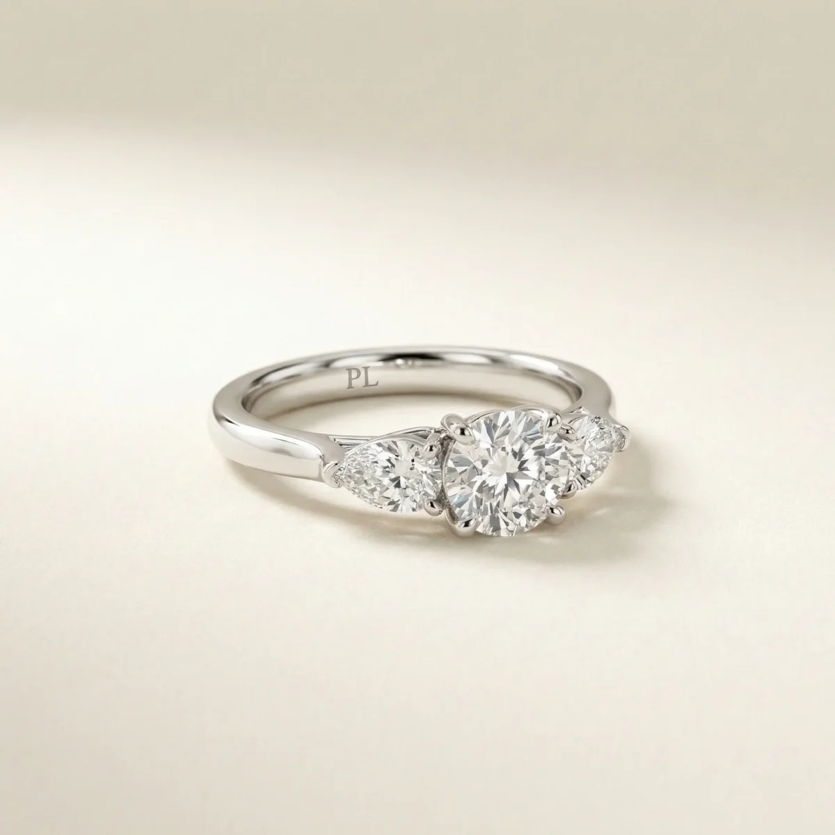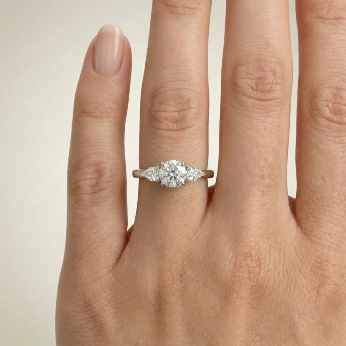 Crafted around a 1 carat round lab grown diamond center, the Aurel ring features a balanced three-stone structure with pear-shaped side diamonds. The composition highlights the center stone while maintaining a refined, proportional silhouette. The design supports proportional customization across the recommended carat range while preserving the structural architecture. Each piece includes professional certification and is produced within the standard 15–35 day manufacturing timeline.
