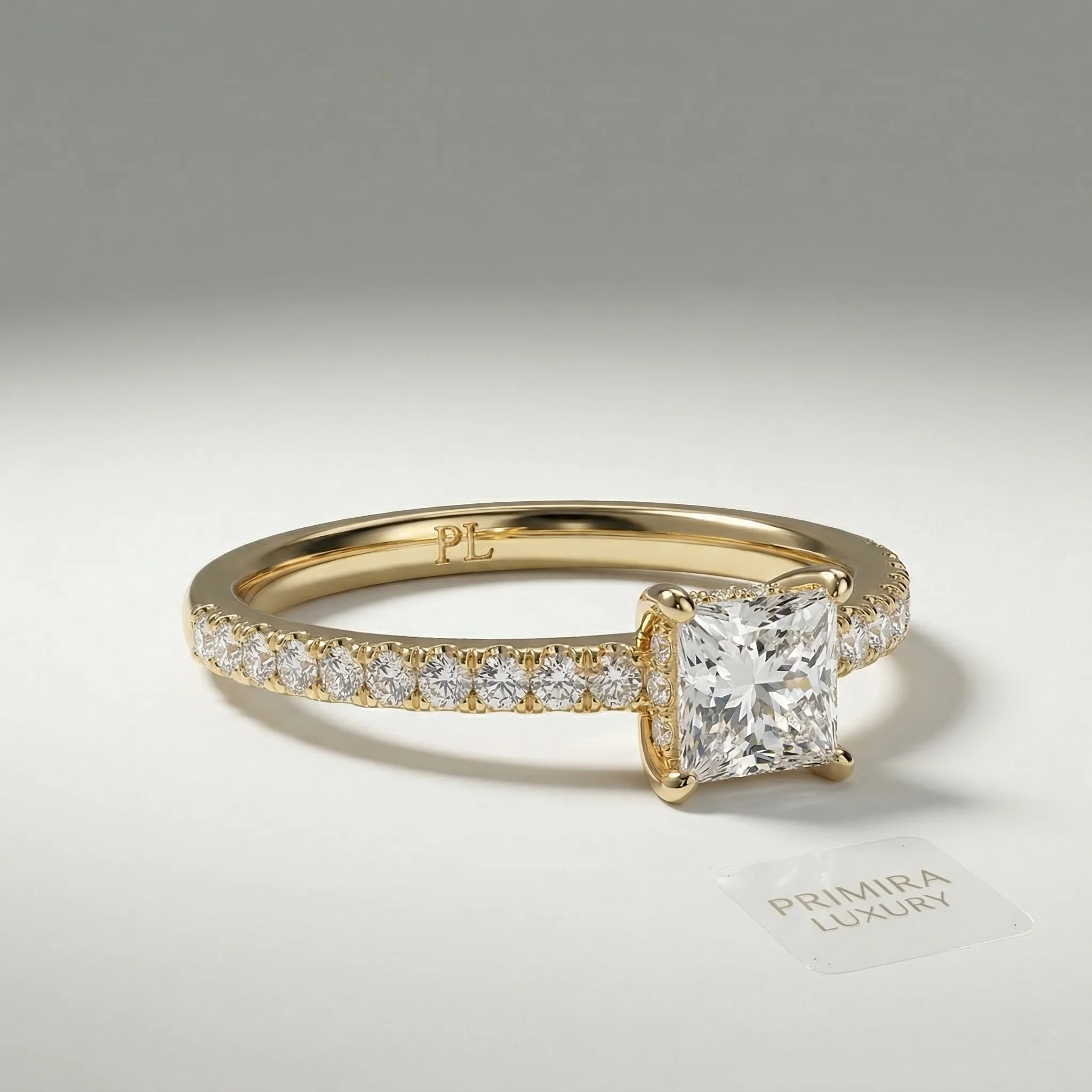 Aureli is a princess-cut solitaire pavé engagement ring designed around a 0.30 ct lab grown diamond, positioned as the central focal point. The elevated four-prong setting creates a clear visual hierarchy, allowing the square geometry of the stone to remain sharply defined while integrating seamlessly into the band.The structure features micro pavé-set diamonds along the shoulders, transitioning into a polished lower shank. The open gallery beneath the center stone ensures light passage while maintaining structural integrity. Prong placement is corner-aligned to secure the princess cut while preserving its symmetry and edge clarity.The design supports proportional customization within the recommended carat range, ensuring consistent balance between center stone size and band width. Transparent pricing adapts to stone selection and size. For clients seeking an alternative, moissanite is offered as an affordable luxury option through consultation, without altering the original structure.Each Aureli ring is delivered with certification from IGI or SGL, ensuring material and stone verification. Production timelines range from 15 to 35 days, with global shipping available.STRUCTURED SPECIFICATIONS • Product Type: Engagement Ring • Design Structure: Solitaire Pavé Ring • Primary Shape: Princess • Stone Layout: Solitaire with Pavé Shoulders • Default Display Carat: 0.30 ct • Recommended Carat Range: 0.25–0.50 ct • Stone Type: Lab Grown Diamond (primary), Moissanite (affordable luxury alternative via consultation) • Metal Options: Gold, Platinum • Customization Level: Structural Adjustable • Certification: IGI / SGL • Production Timeline: 15–35 days