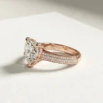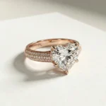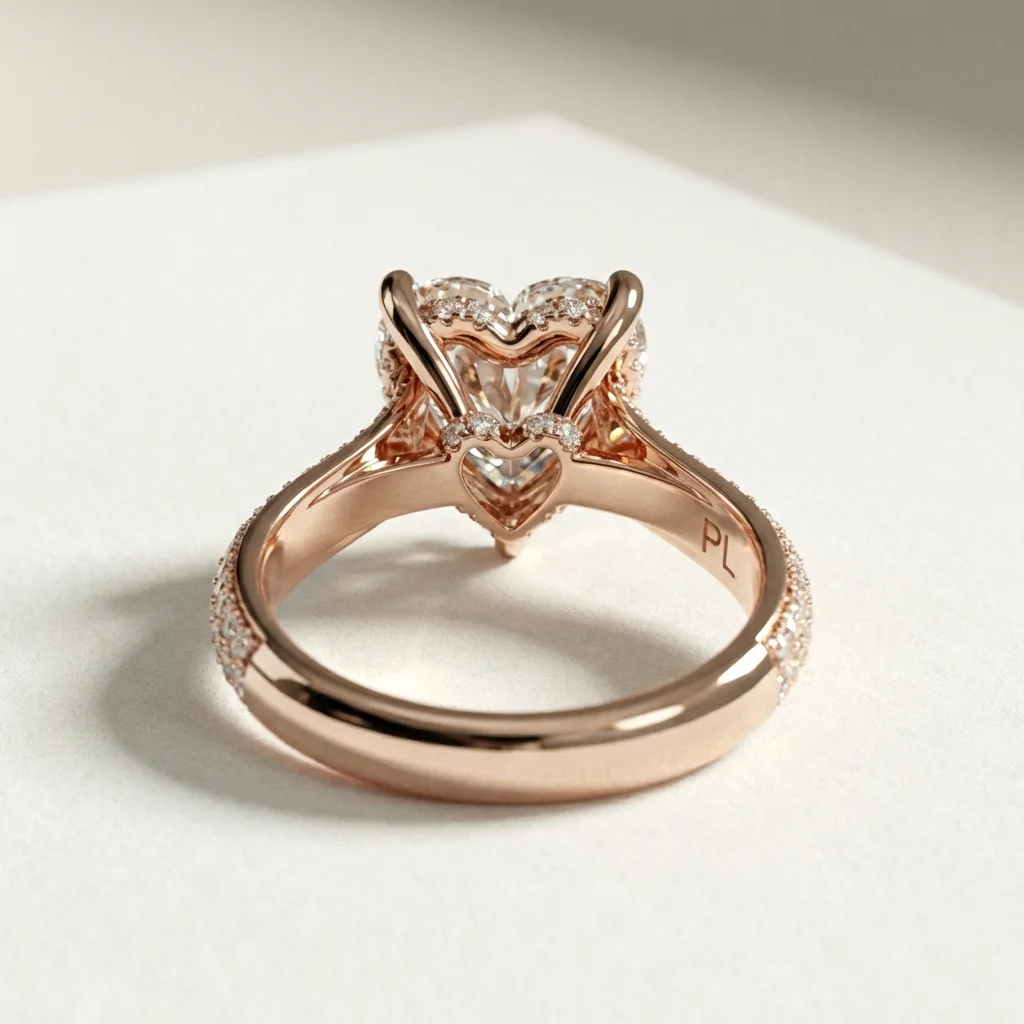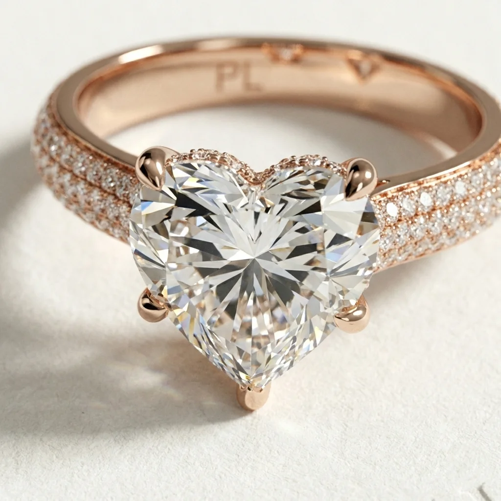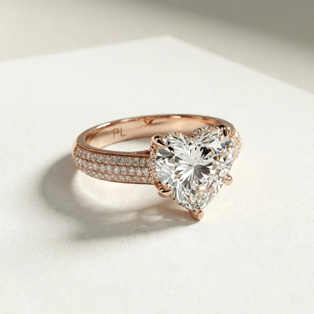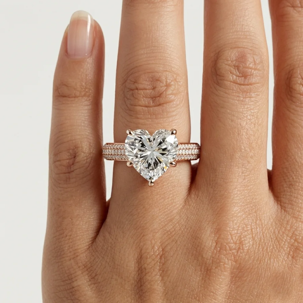 Aureva is a heart-shaped cathedral pavé engagement ring centered around a 1.00 carat lab grown diamond. The elevated setting and dual pavé shoulders create a clear visual hierarchy while maintaining balanced proportions on the finger. Crafted primarily in gold or platinum, the design supports proportional customization across a recommended 0.75–1.50 carat range. Each ring includes third-party certification and is produced to order for precise sizing and finish.