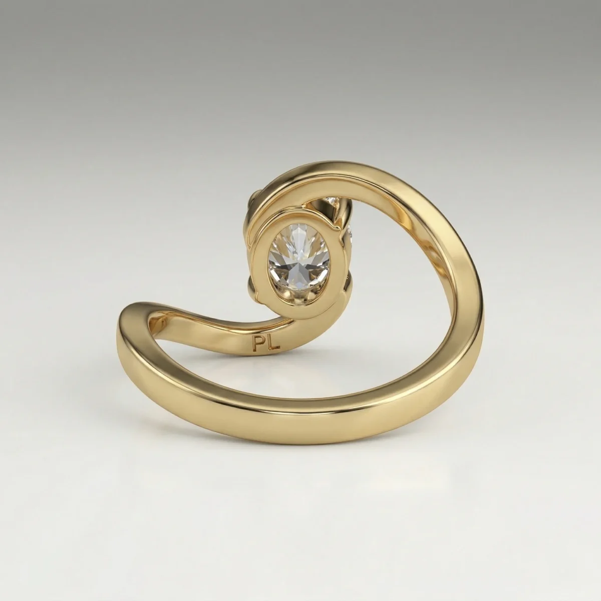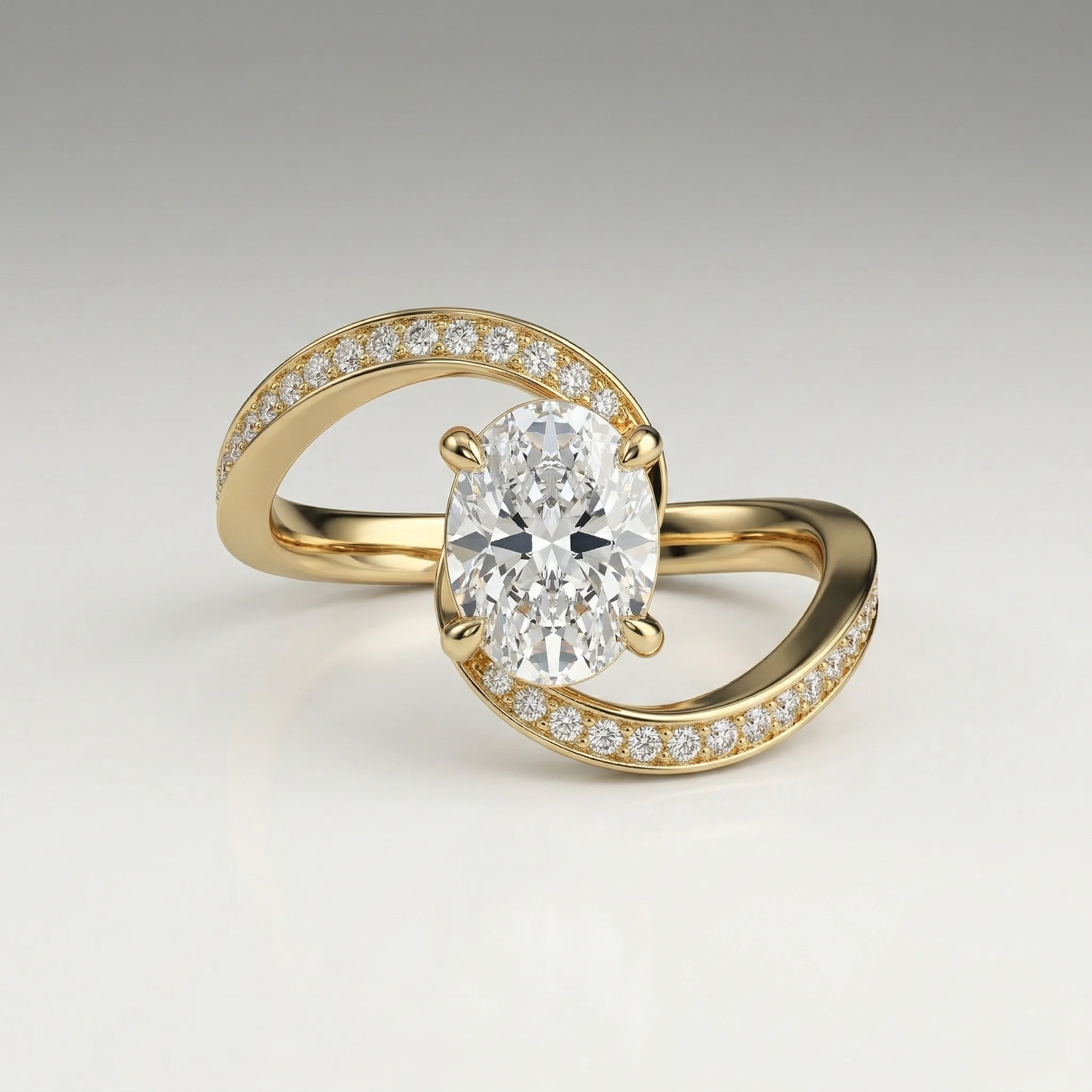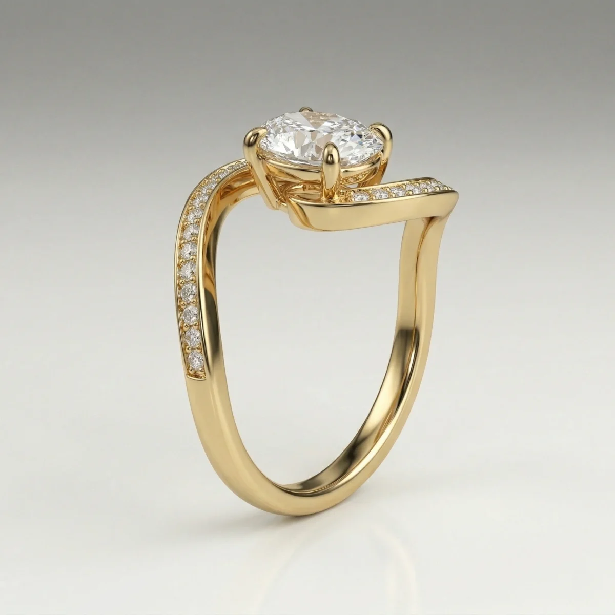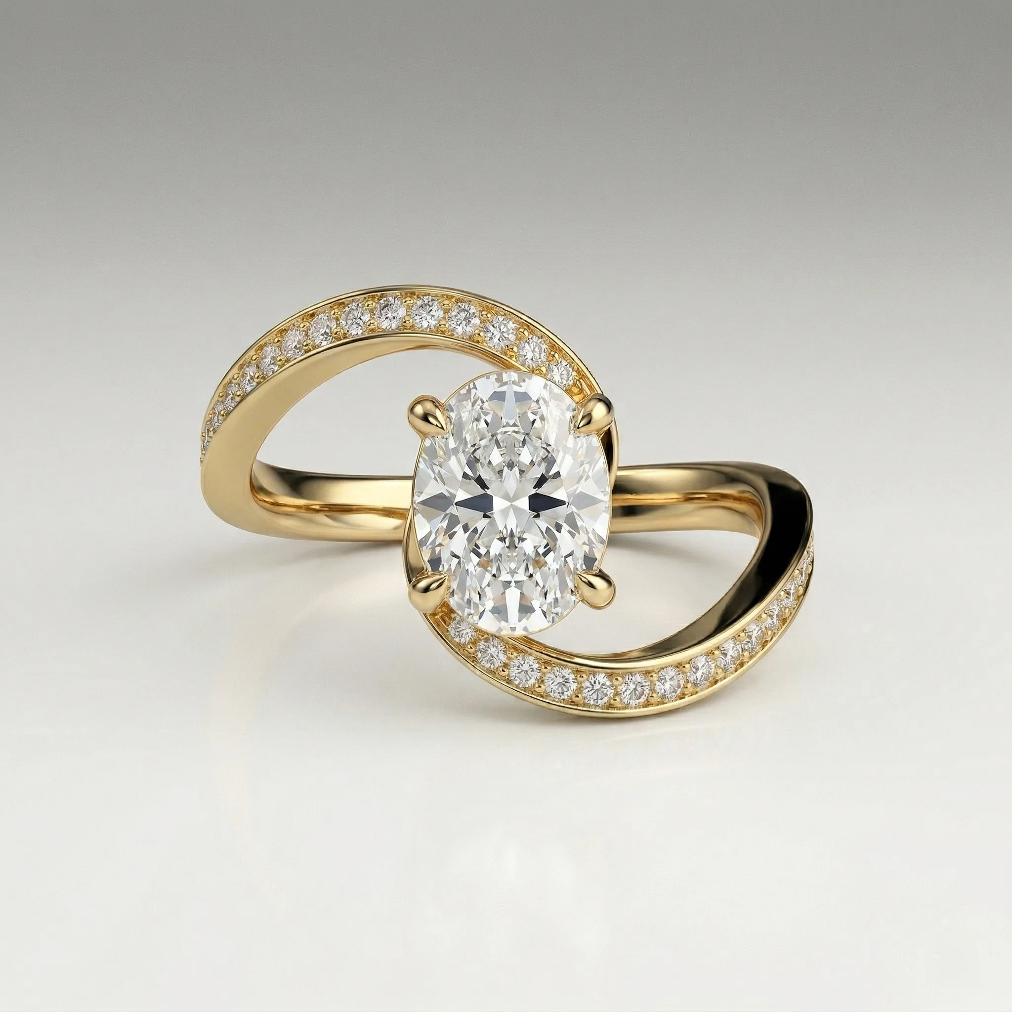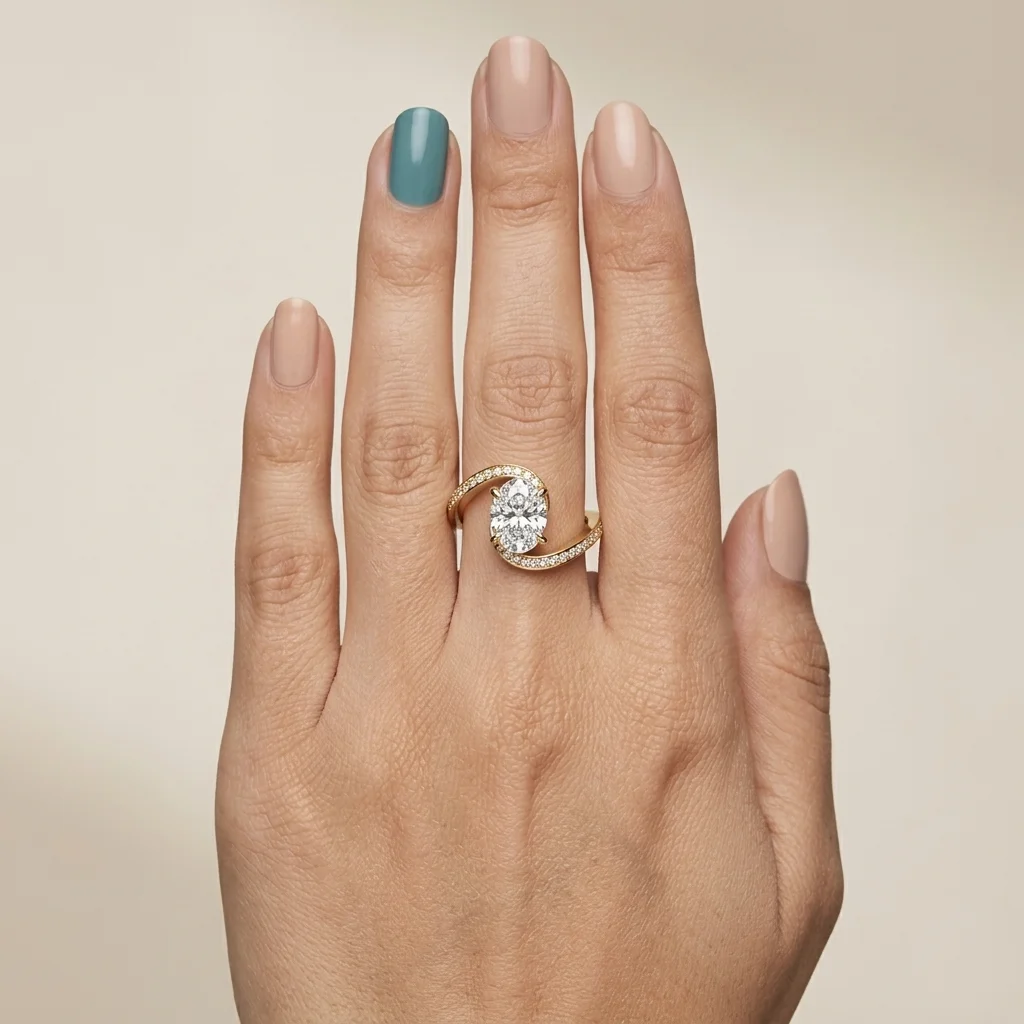 Defined by a fluid bypass structure, this ring centers a 1.0 carat oval lab grown diamond within a clean, elevated setting. Pavé-set accents along the shoulders introduce controlled brilliance without disrupting the core silhouette. Crafted primarily in precious metal options with proportional customization support, the design adapts across a 0.75–1.50 carat range. Each piece includes certification and follows a structured production timeline.