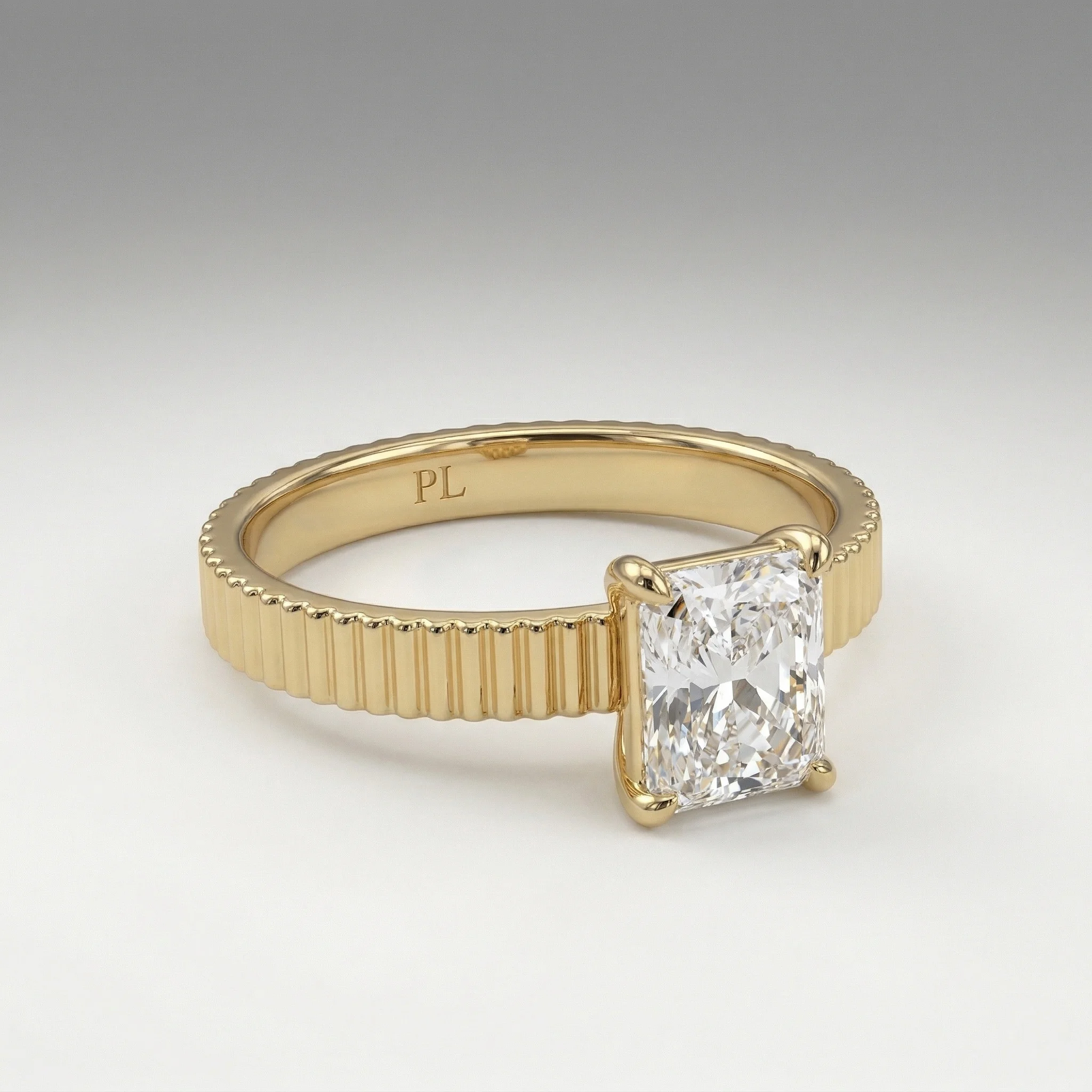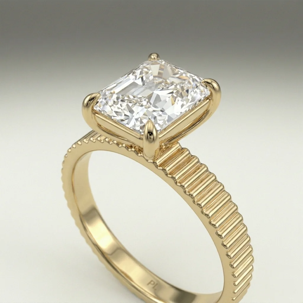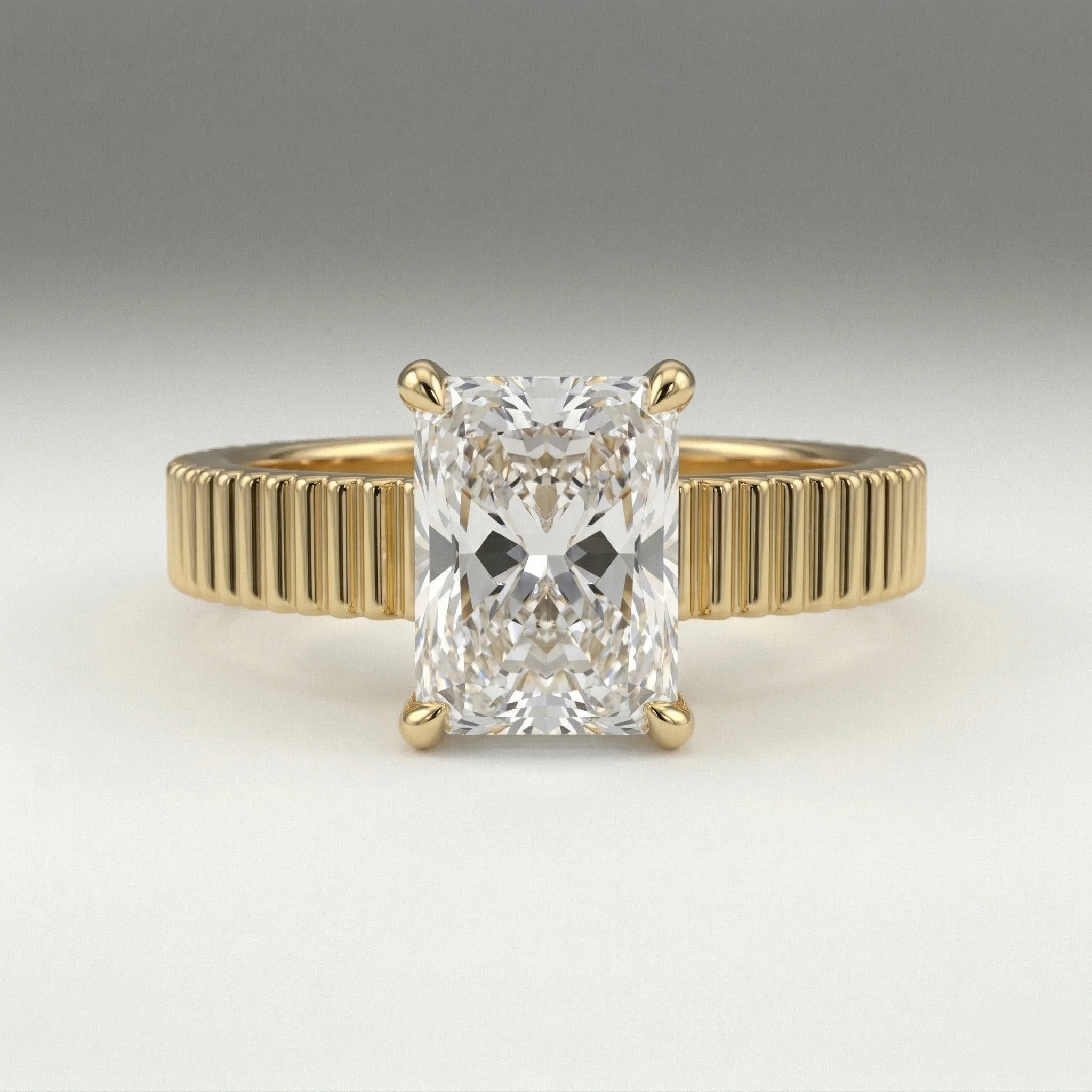 Defined by a sculpted fluted band and a 1.00 carat radiant lab grown diamond, this engagement ring presents a clean, elevated solitaire structure. The open gallery and four-prong setting maintain precise stone positioning while allowing light flow. Crafted primarily in gold or platinum, the design supports proportional customization across carat sizes. Certification is included, ensuring verified stone quality and consistency.
