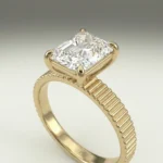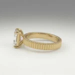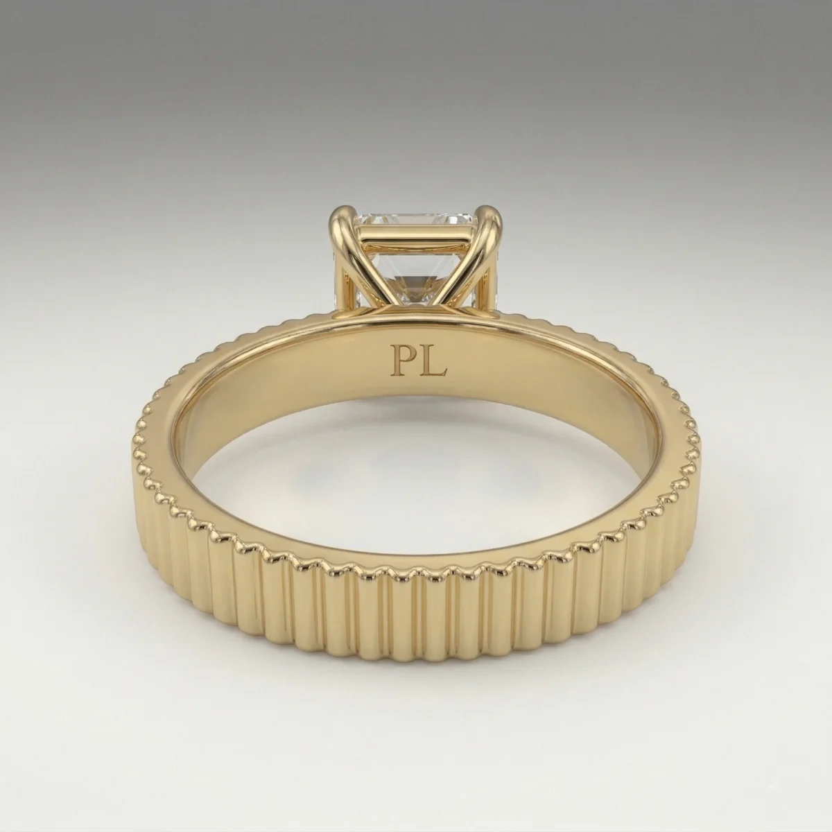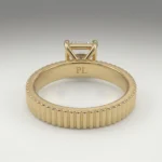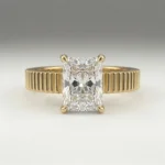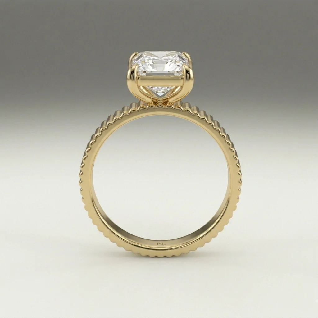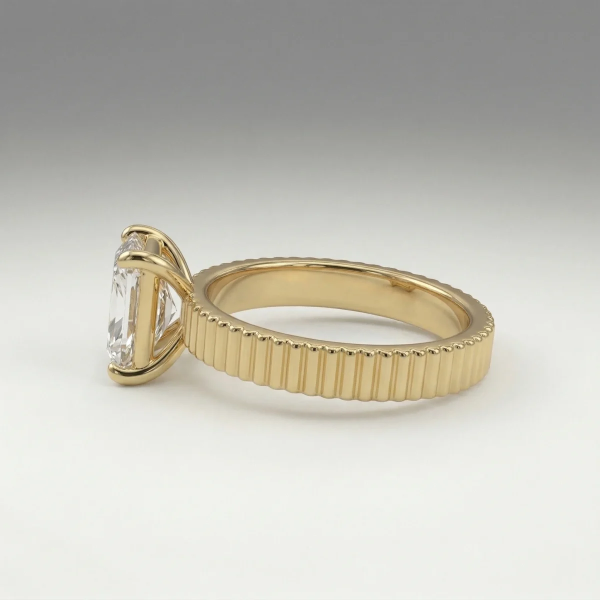 Defined by a sculpted fluted band and a 1.00 carat radiant lab grown diamond, this engagement ring presents a clean, elevated solitaire structure. The open gallery and four-prong setting maintain precise stone positioning while allowing light flow. Crafted primarily in gold or platinum, the design supports proportional customization across carat sizes. Certification is included, ensuring verified stone quality and consistency.
