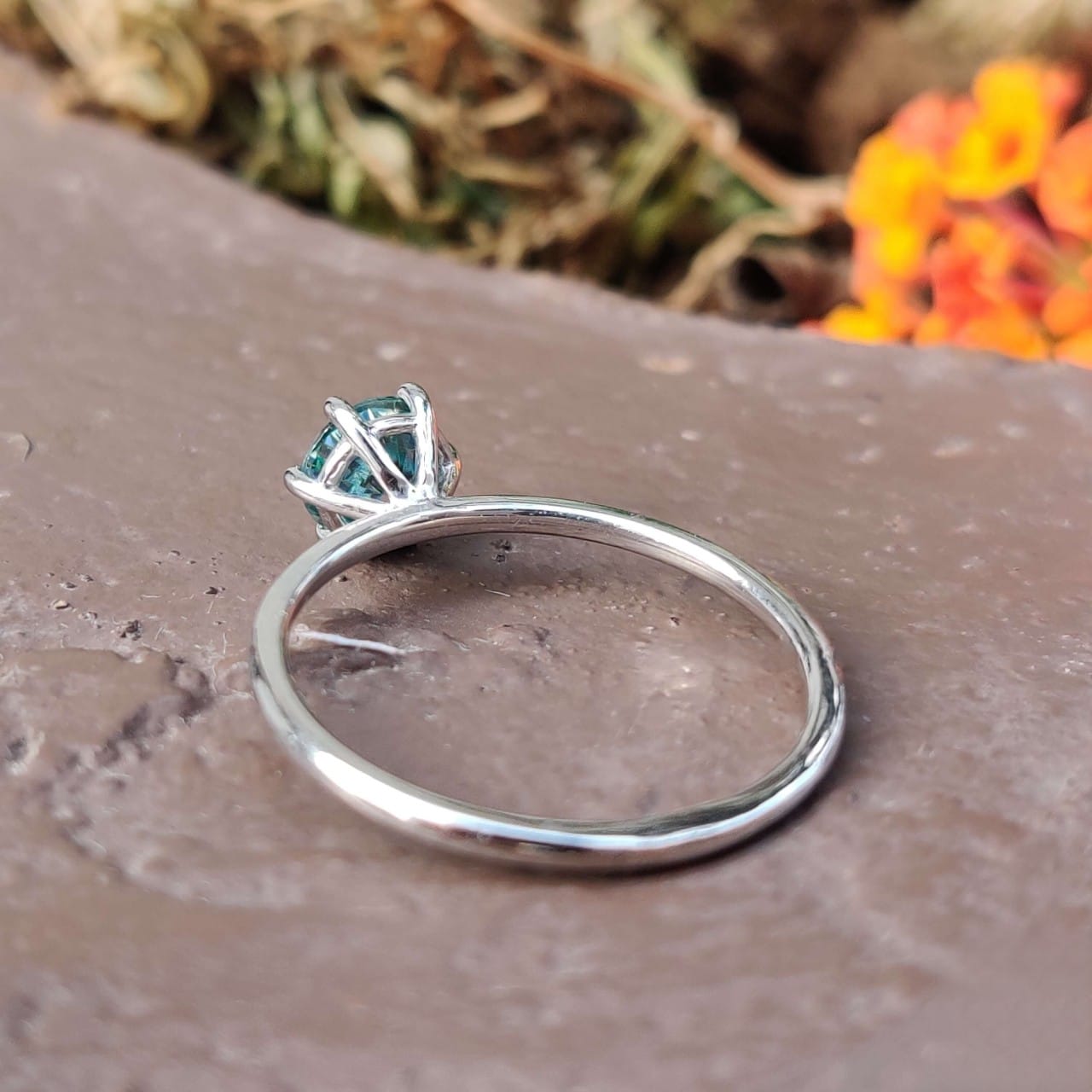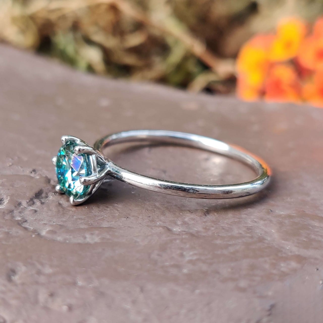 The Azure Dream Round Solitaire Ring radiates effortless charm with its 1 carat fancy blue round moissanite and delicate pave-dusted shoulders. A chic anniversary keepsake, customizable in your preferred tone and metal. Bold. Elegant. Yours. See what else we offer.