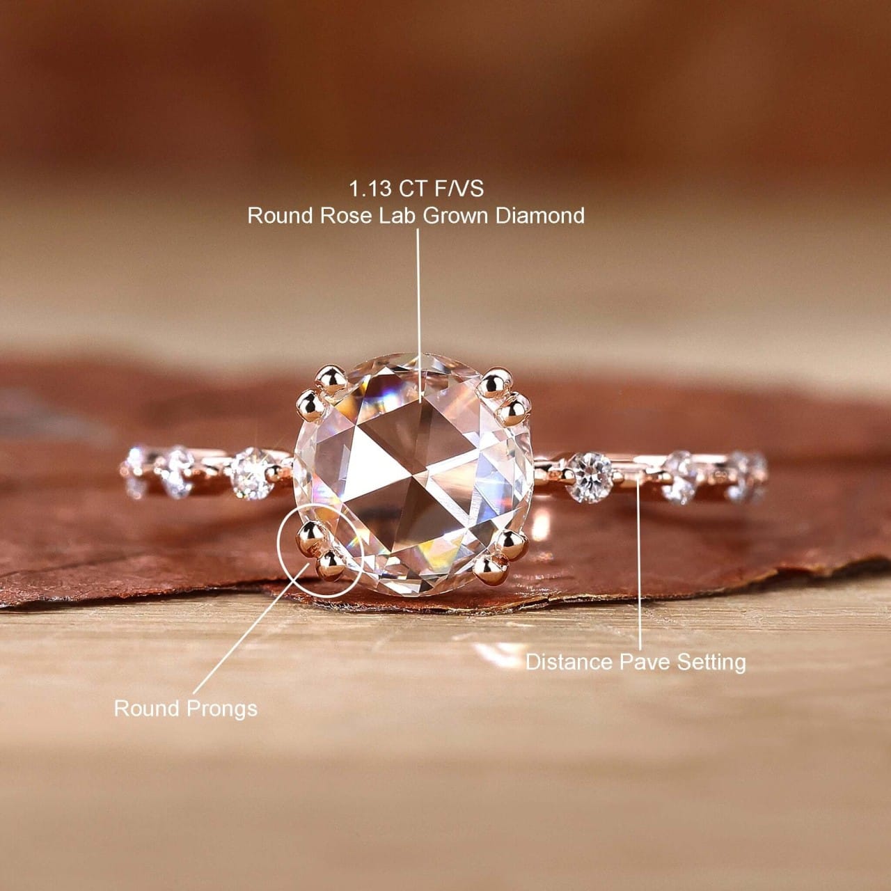 The Celeste ring exudes Graceful charm with a 1.5 carat round rose cut diamond in dazzling white (DEF), radiating crystalline brilliance. Fully customizable in your preferred metal and tone. Love this sparkle? Discover more in our curated collection.