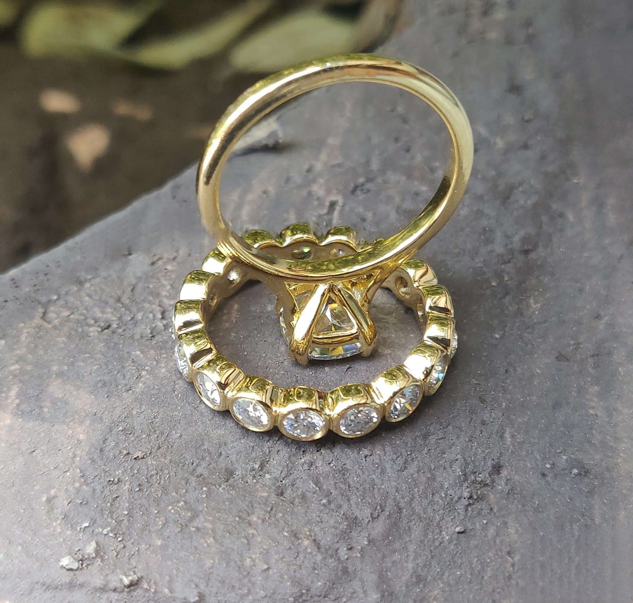 A radiant tribute to Art Deco Revival, the Divine Ascension bridal set channels a timelessly classic aesthetic with rich vintage cues. Designed for the gracefully poised, this cathedral-style masterpiece evokes refined elegance with every angle. At its heart lies a 3.5 carat cushion-shaped white (DEF) moissanite, shimmering atop pave-dusted shoulders for unforgettable brilliance.