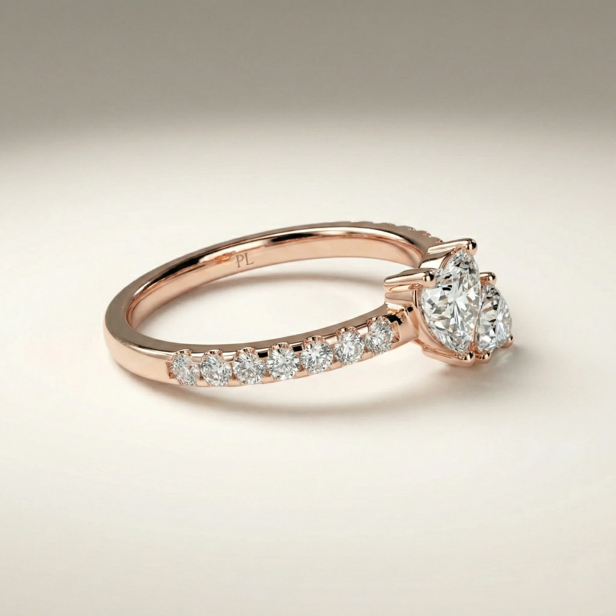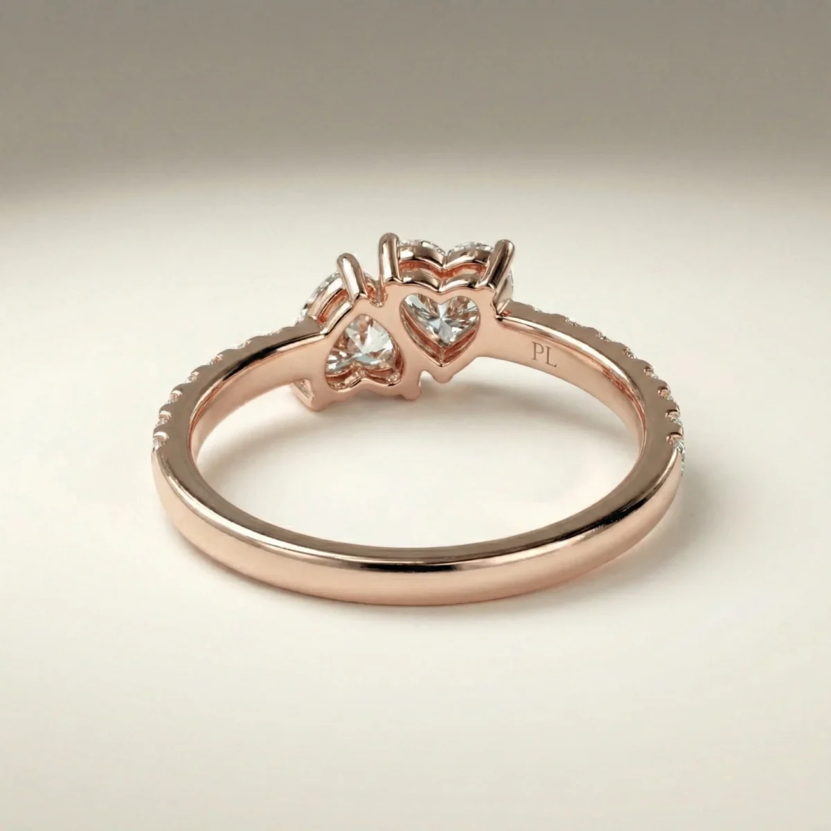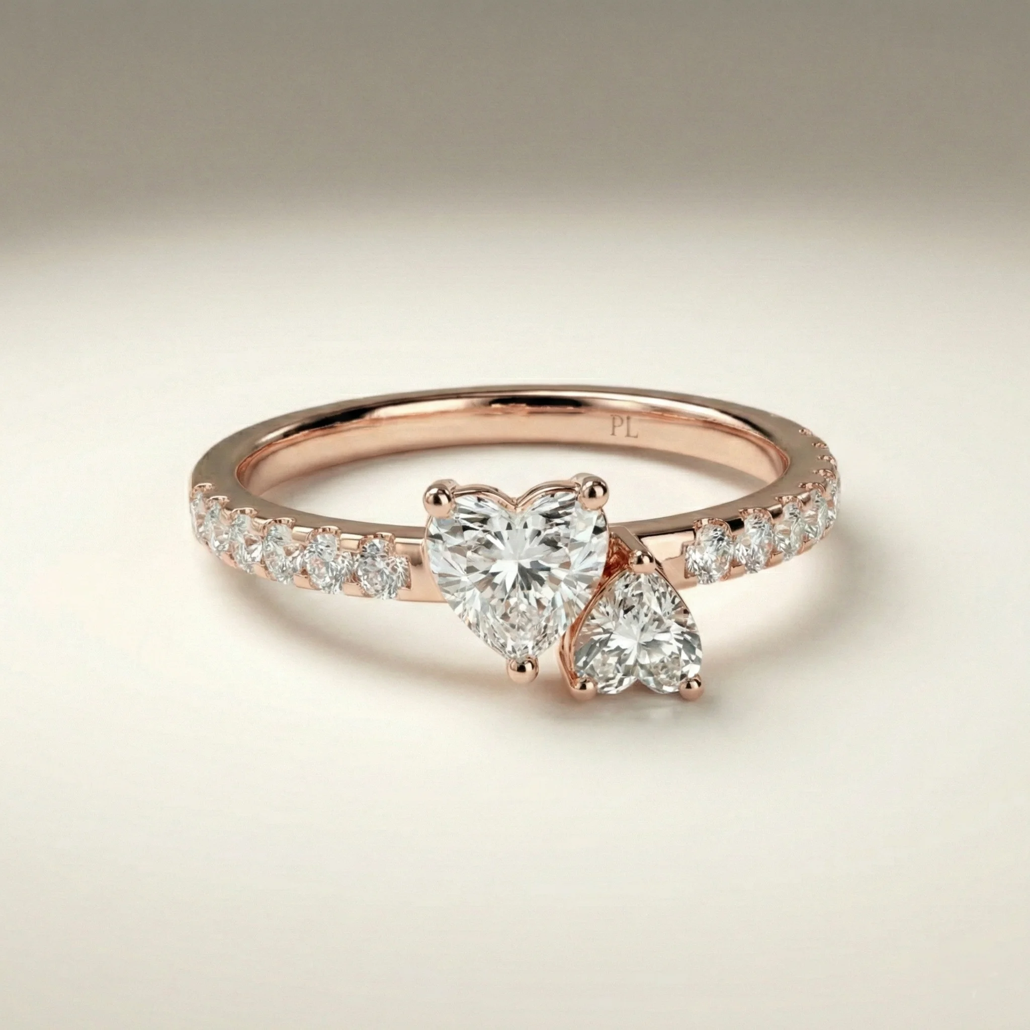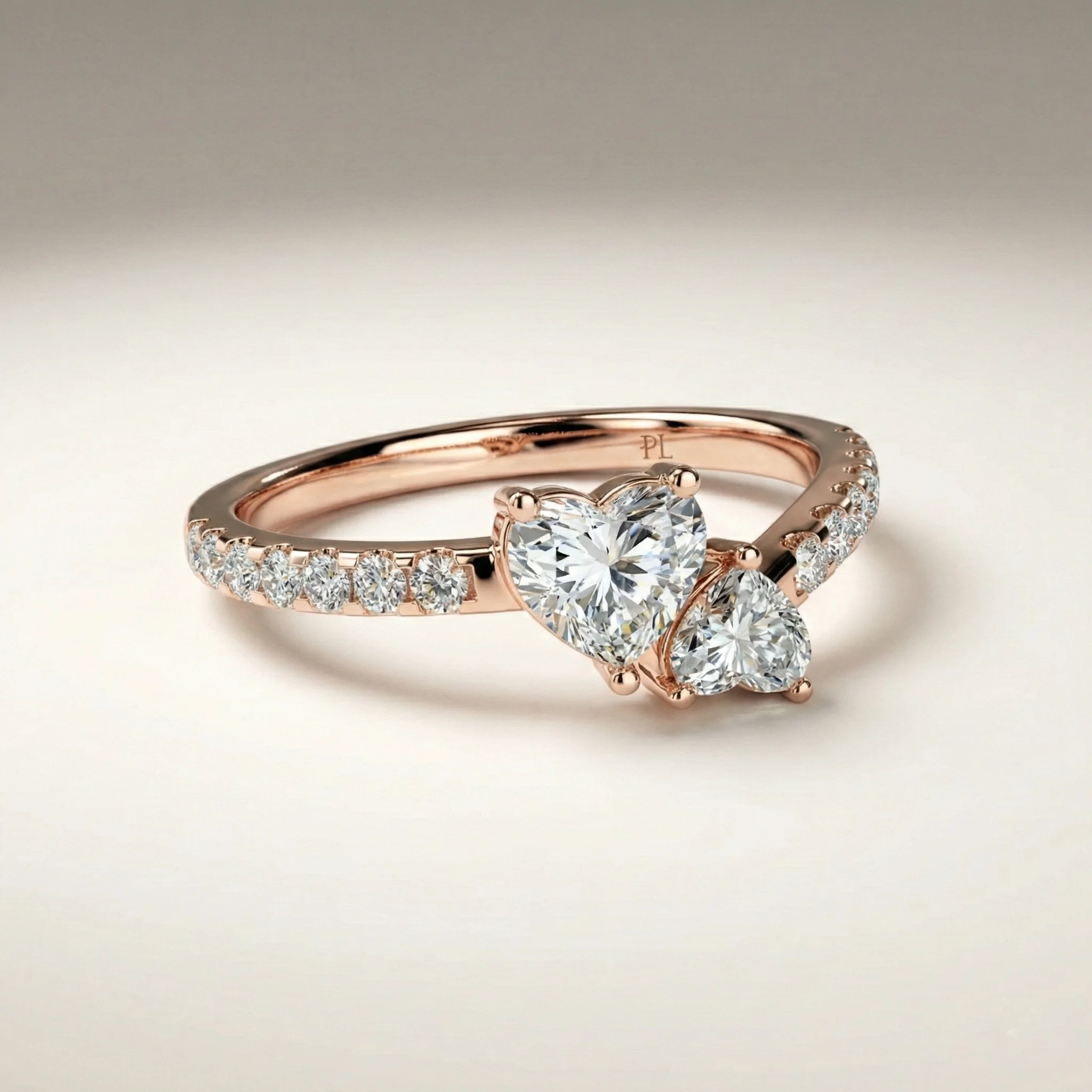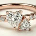 Designed around a paired-heart composition, this ring features approximately 0.75 ct total lab grown diamonds arranged in an asymmetric bypass structure. The design highlights two heart-cut stones supported by pavé-set accents along the shoulders. Crafted primarily in precious metal options such as gold or platinum, the ring supports proportional customization across carat sizes and finishes. Each piece is produced to order and includes independent certification for the lab grown diamond center stones.