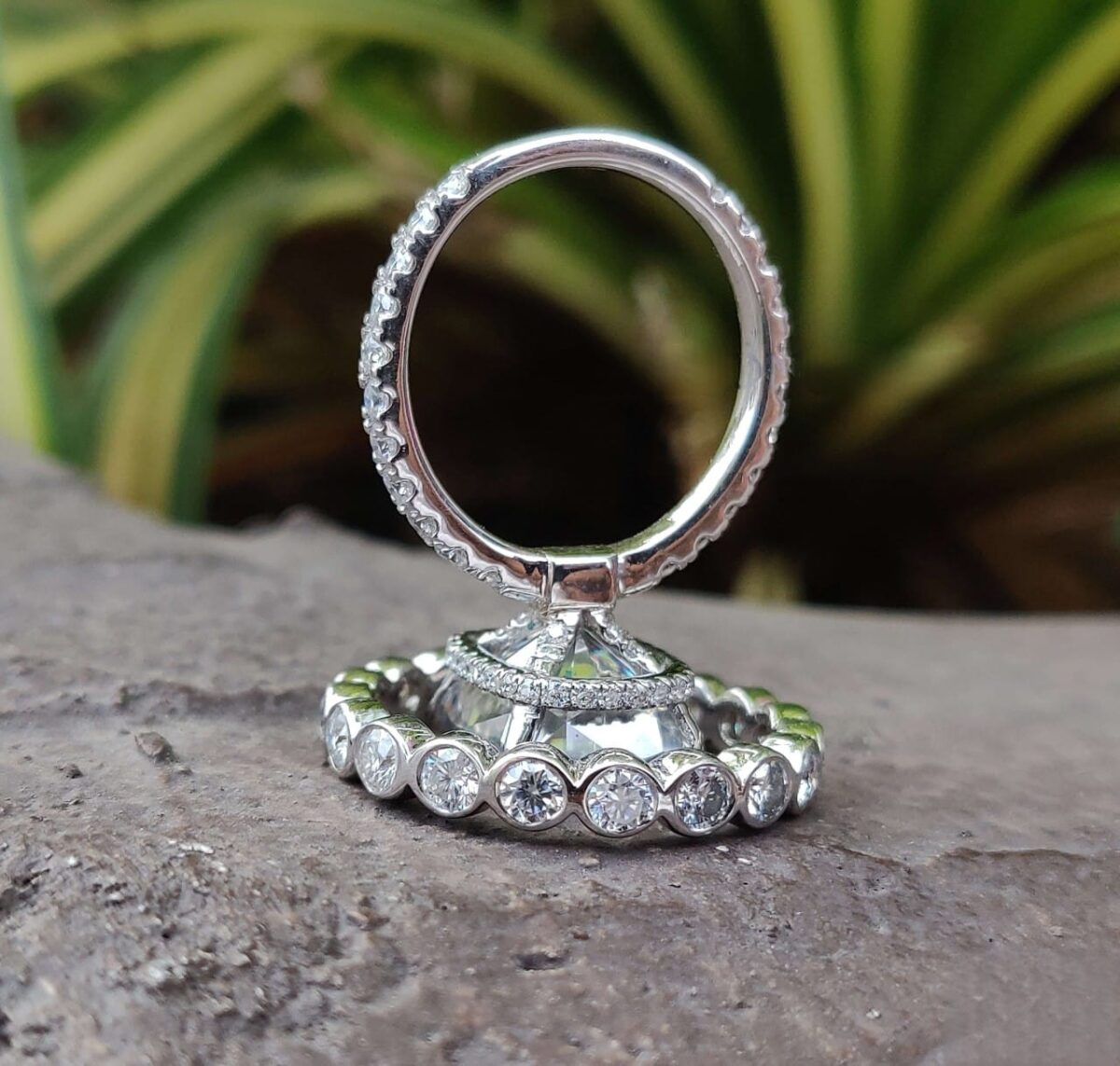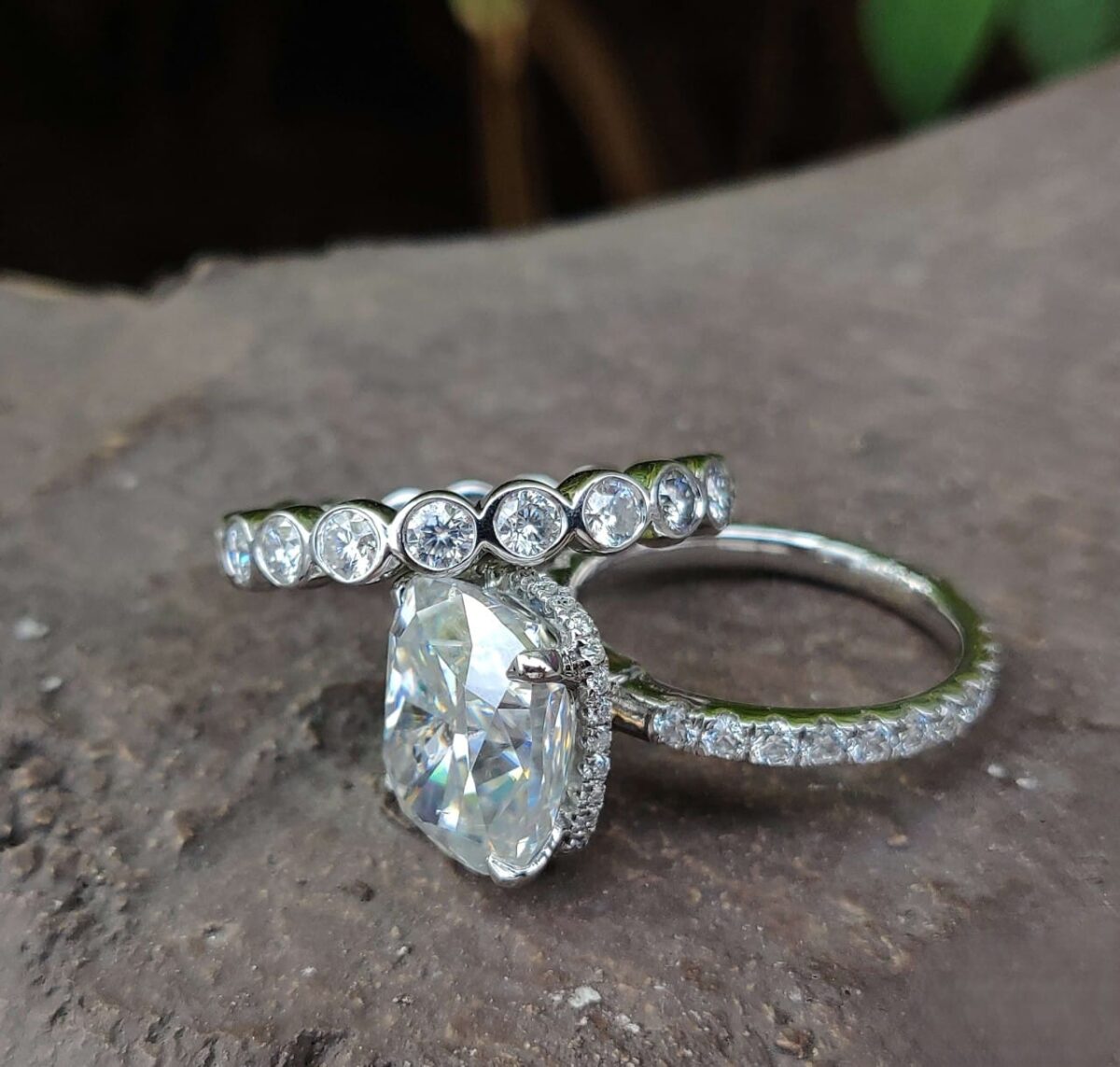 Command the room with the Eternal Glow bridal set—a bold, 8.5 carat elongated cushion-cut white (DEF) moissanite framed by a silken-polished band. Fully customizable in your preferred metal and tone. Love this sparkle? Discover more in our curated collection.