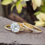 The Graceful Curves bridal set features a 1.5 carat round-cut white (DEF) moissanite in a flawless-cut silhouette. Customizable in your chosen metal and tone. Looking for timeless elegance? Explore more exquisite styles.