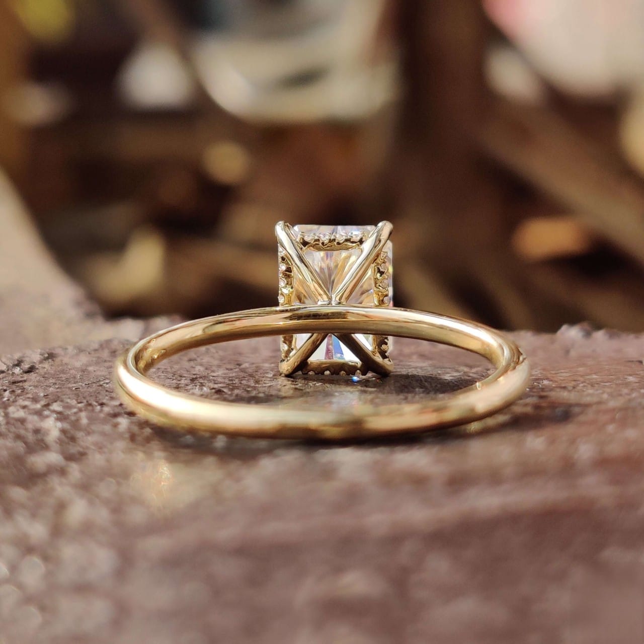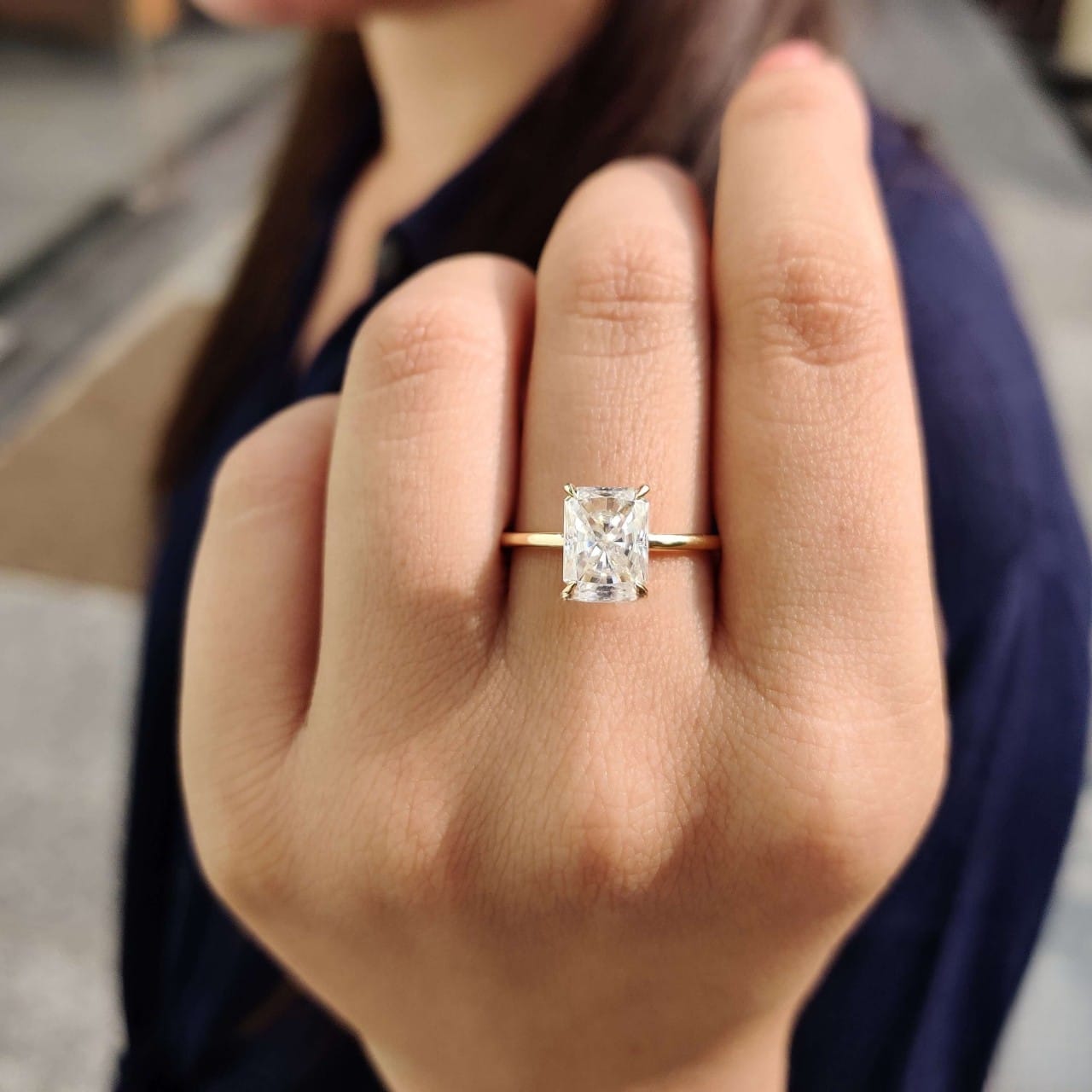 Inspired by the Hollywood Golden Age, the Hidden Lumina 2.39 TW Radiant-Cut Halo Moissanite Ring exudes timeless allure. Designed for the elegant minimalist, it evokes radiant joy through a dazzling 2.5 carat radiant-cut white (DEF) moissanite, nestled in a tapered cathedral arch setting.