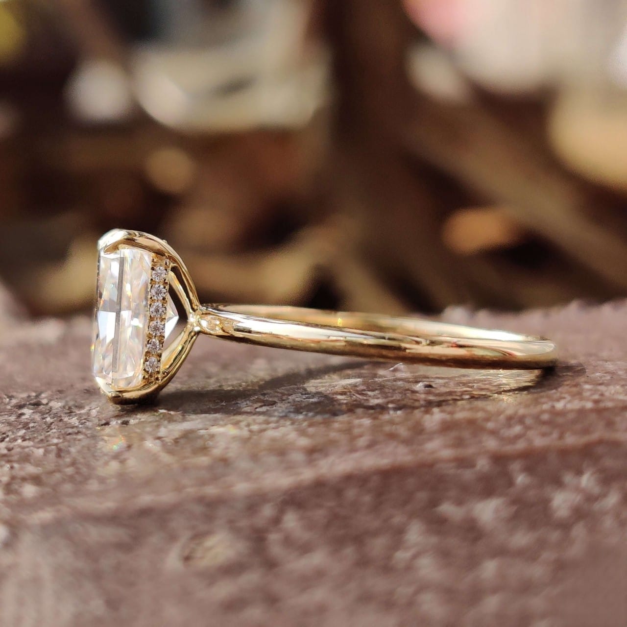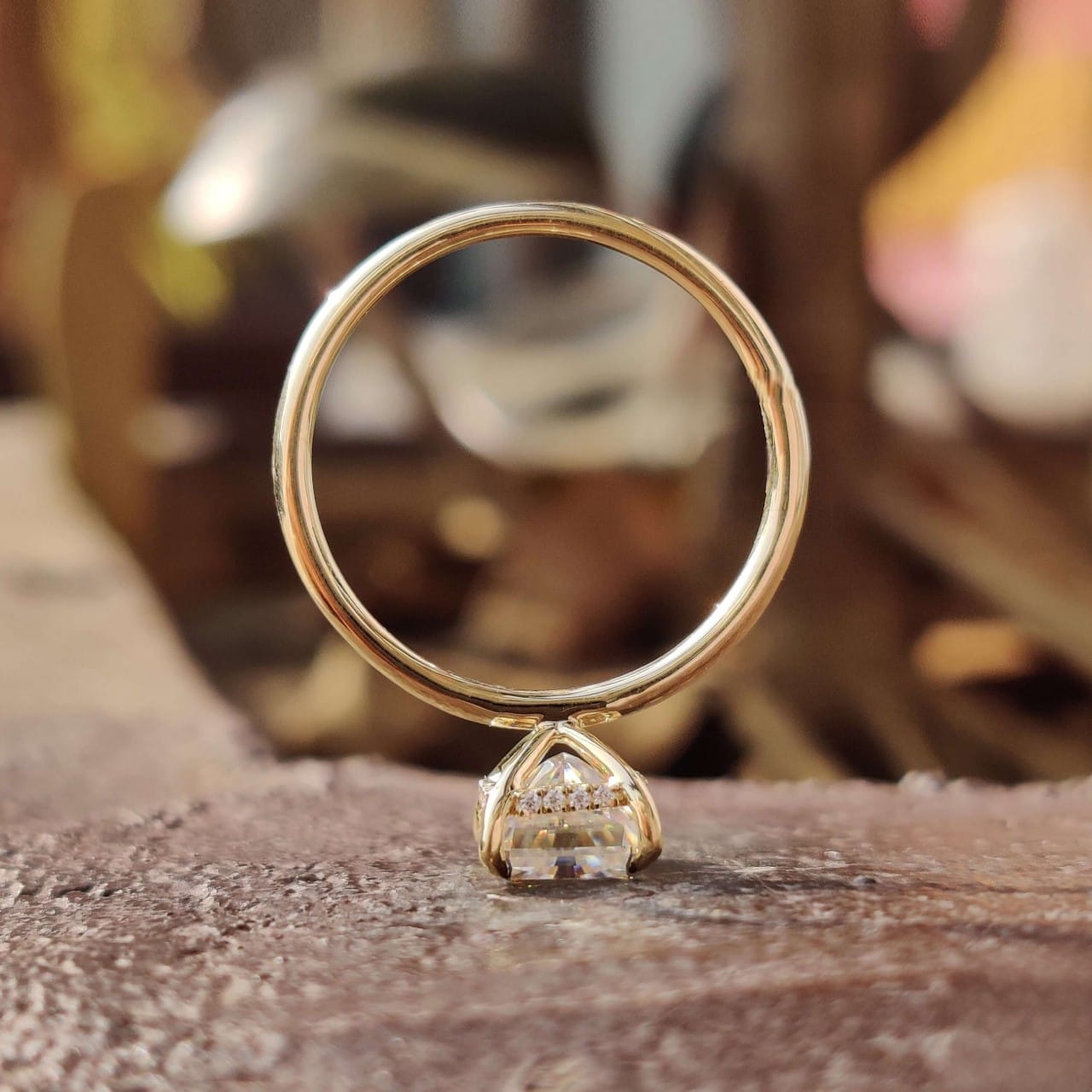 The Hidden Lumina is also available in white, yellow, or rose tones, and can be crafted in your choice of 10kt, 14kt, 18kt gold, or silver, offering ultimate personalization. Discover more bold and expressive creations in our radiant moissanite statement ring collection.