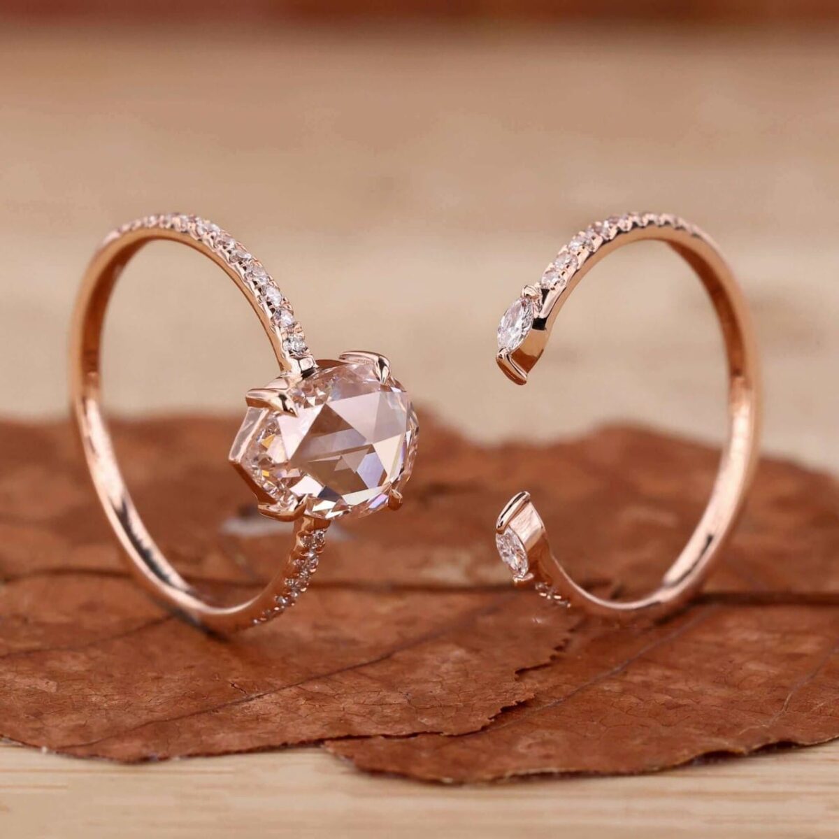 The Rose Bloom Bridal Set radiates delicate intimacy with its pear-shaped white rose cut diamond — a sculpted 2 carat treasure. Customizable in your choice of metal and tone. Looking for timeless elegance? Explore more exquisite styles.