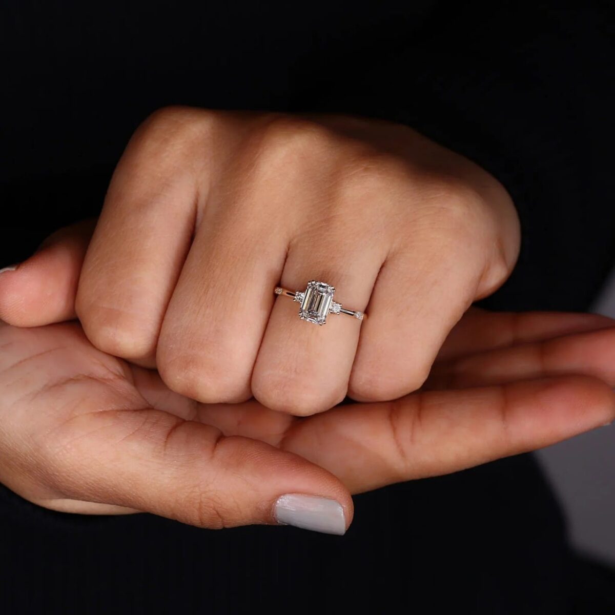 Echoing the refined romance of the Victorian-Inspired era, the Tranquil Elegance three-stone ring speaks to those with a Chic and Sophisticated edge. Designed to evoke Effortless Charm, it features a striking 1.5 carat emerald-cut white (DEF) diamond, radiating brilliance through its flawless-cut silhouette.