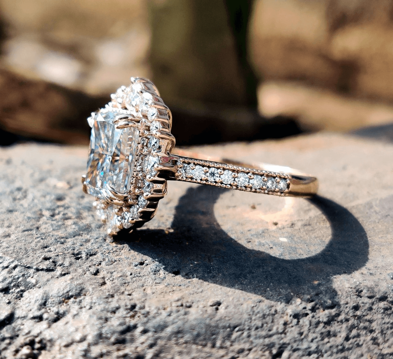 Its centerpiece—a 3.5 carat radiant-cut grey moissanite—is cradled in a delicate halo, flowing into pavé-dusted shoulders that shimmer with movement. Crafted in 18kt gold with a soft rose tone, it’s a tribute to a once-in-a-lifetime anniversary, lovingly gifted after a heartfelt confession.