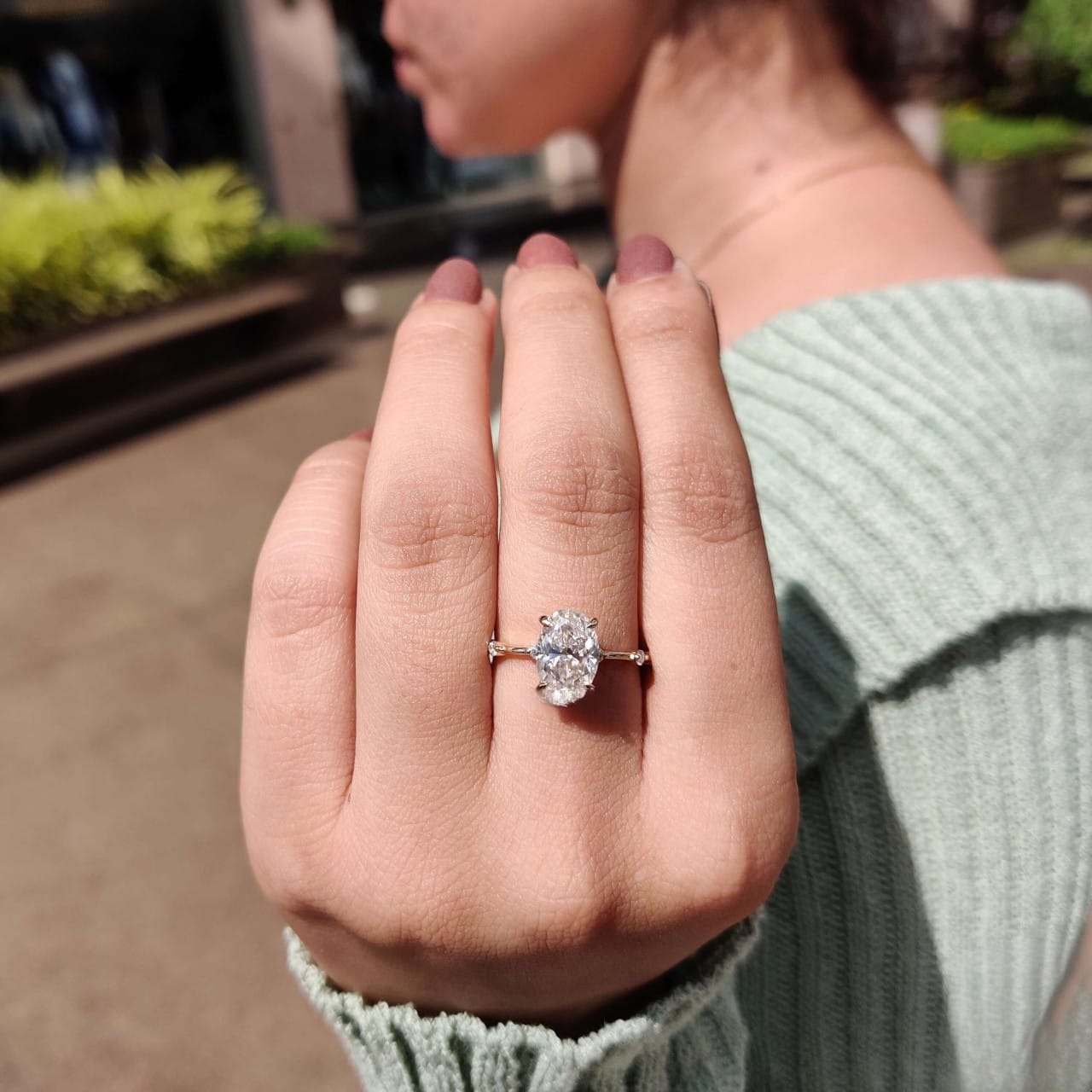 Celebrate love’s radiant glow with the Vintage Splendor ring—featuring a 2.5 carat oval-cut white moissanite, glowing with luminous luster. Customizable in your tone and metal. Bold. Elegant. Yours. See what else we offer.