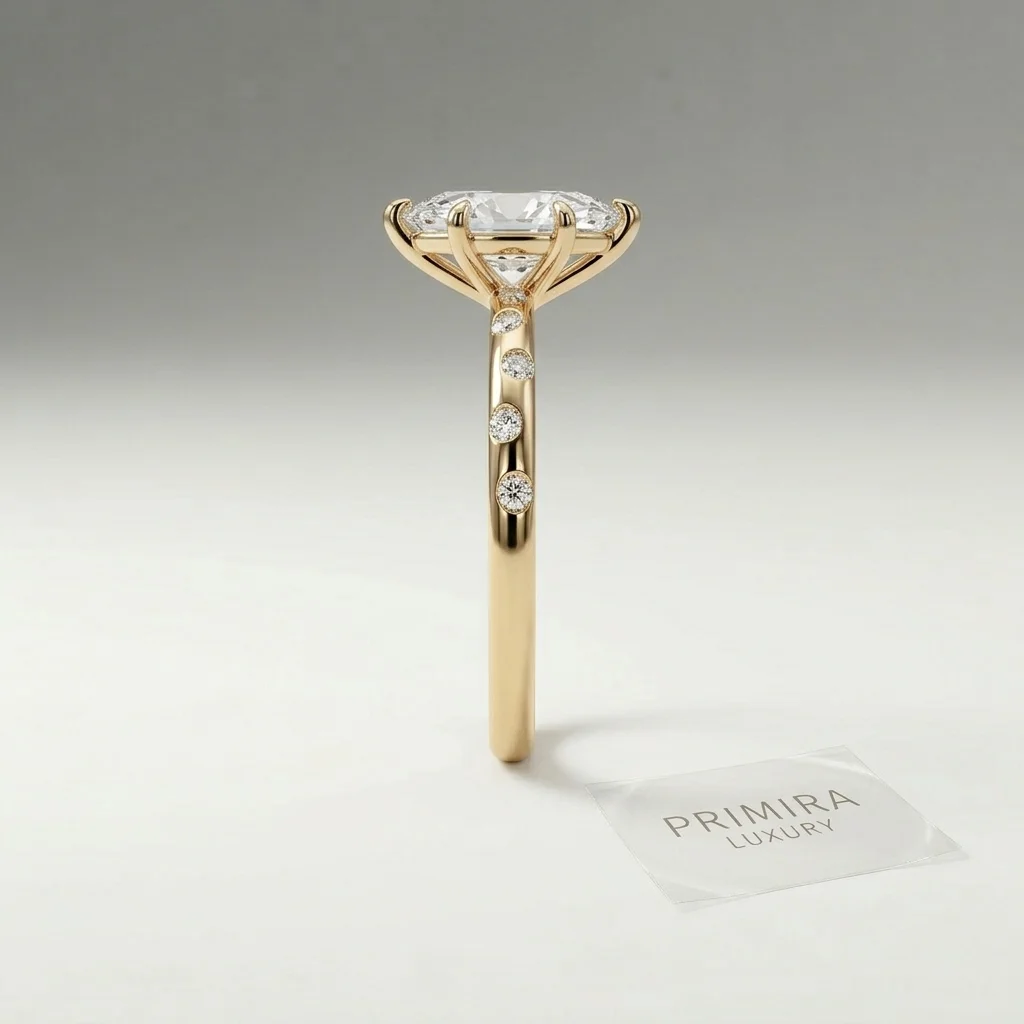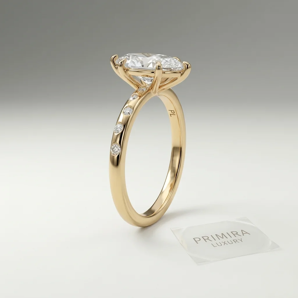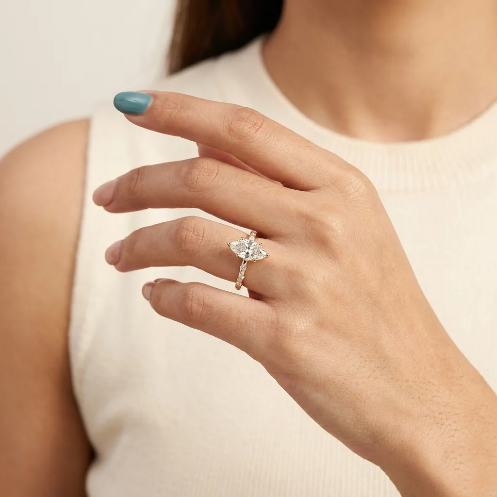The Virella ring centers around a refined marquise lab grown diamond, typically showcased at a 1.50 CT display size. Its elevated six-prong setting and delicate pavé shoulders create a balanced profile that emphasizes the elongated brilliance of the center stone. Crafted primarily in gold or platinum, the design supports proportional customization within the recommended carat range. Each piece includes certification and is produced through a structured manufacturing process ensuring clarity of quality and origin.