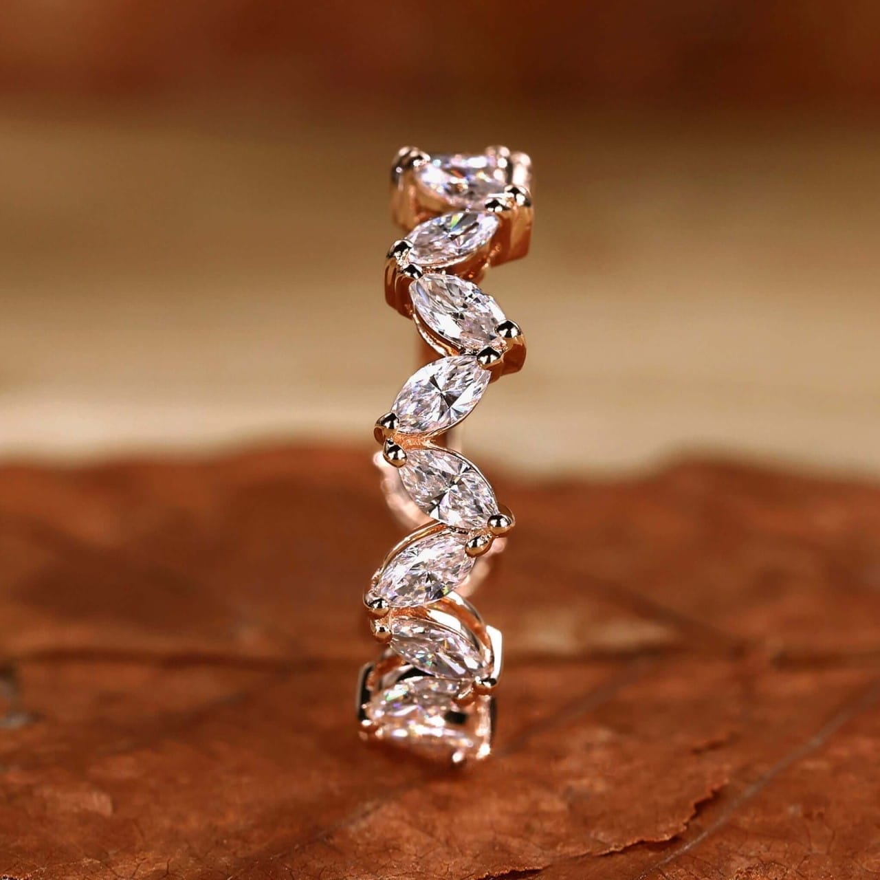 Inspired by the Regal Maharani design era, the Zig-Zag ring channels the essence of Graceful and Poised femininity while evoking a sense of Refined Elegance. This artistic twist band dazzles with 1.5 carats of marquise-shaped white (DEF) diamonds, seamlessly flowing along a silken-polished band.